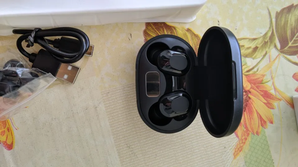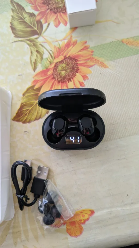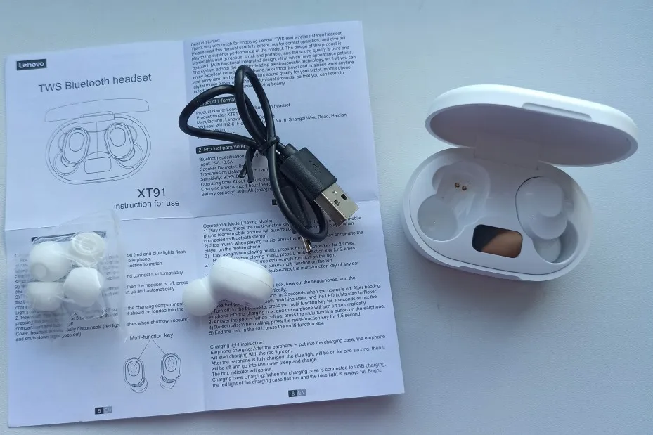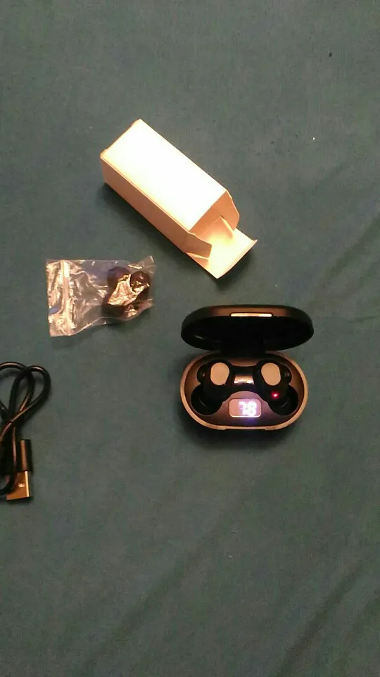 Как на фотографиях магазина. Прибыл быстро и в хорошем состоянии. Эти наушники лучше держатся в моих ушах, так как модель XT91 EarPods. Качество музыки между наушниками одинаковое. За сумму денег они довольно хороши. Данное зарядное устройство не имеет дисплея зарядного устройства (например, модель XT91), но только 4 небольших светодиода, которые показывают грузоподъемность.