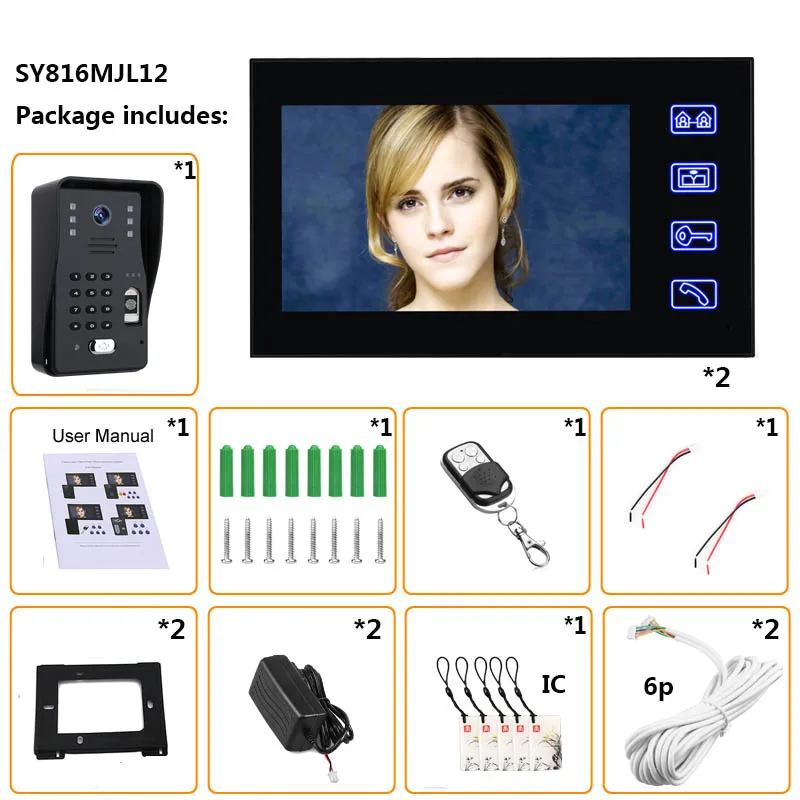 SY816MJL12 посылка входит:1 * наружная камера2 * внутренний монитор2 адаптера переменного тока6-жильный соединительный кабель 2*5 м2 * 2-жильный соединительный кабель5*125 кГц RFIC карты1 * пульт дистанционного управления1 посылка винтов1 * Руководство пользователя-на английском языке