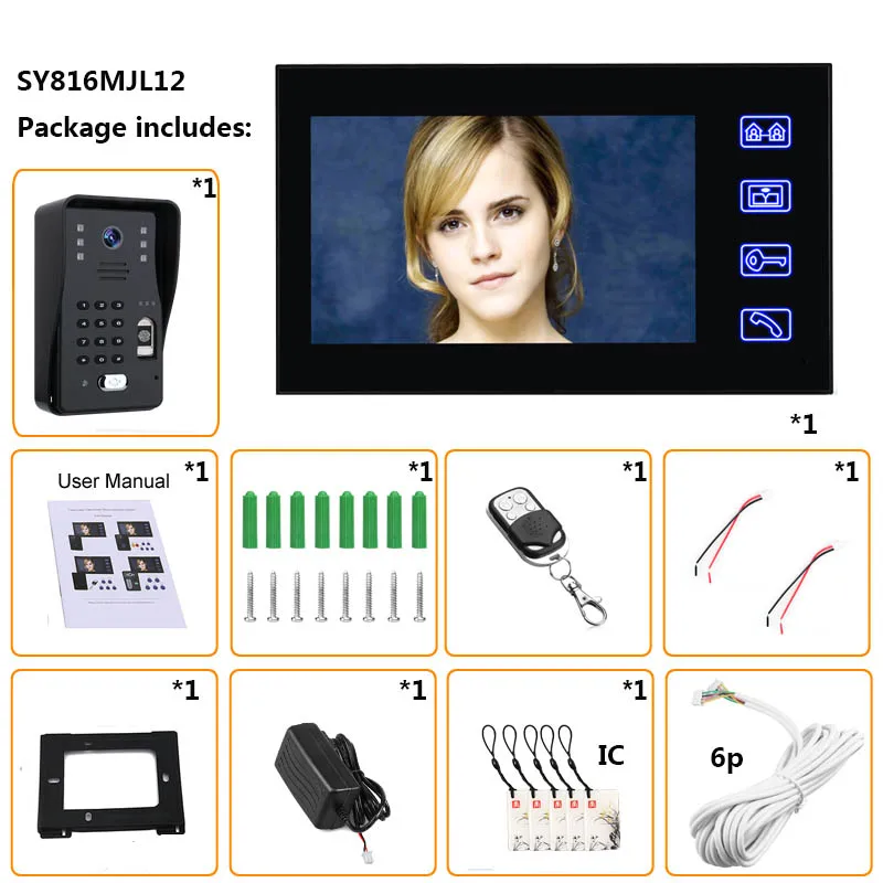 SY816MJL11 посылка входит:1 * наружная камера1 * внутренний монитор1 адаптер переменного тока6-жильный соединительный кабель 1*5 м2 * 2-жильный соединительный кабель5*125 кГц RFIC карты1 * пульт дистанционного управления1 посылка винтов1 * Руководство пользователя-на английском языке
