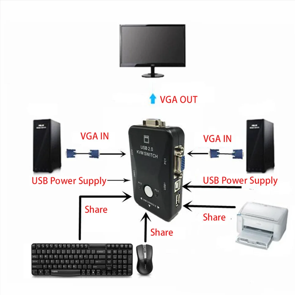 Этот продукт позволяет управлять до 2 ПК с одной USB клавиатуры и мыши! Он отлично подходит для рабочих станций, тестовых скамеек или в любом месте, где требуется работа между компьютерами.Портативный и легко устанавливается, переключение между компьютерами контролируется нажатием кнопки на верхней части устройства.Особенности и характеристики:100% новый ремешок и высокое качествоUSB 2,0 2-Портовый KVMПодключает usb-клавиатуру, usb-мышь и видео к 2 шт.Максимальное разрешение 1920x1440Полоса пропускания 250 МГцРучной переключательСветодиодный индикатор (PC1, PC2)Поддерживает различные режимы автоматического сканирования с интервалом задержкиПодключи и работайГорячая заменаПоддержка онлайн-игр и DVR Введение продукта:1 х 2-Порты и разъёмы USB 2,0 KVM переключатель1 x Руководство пользователя