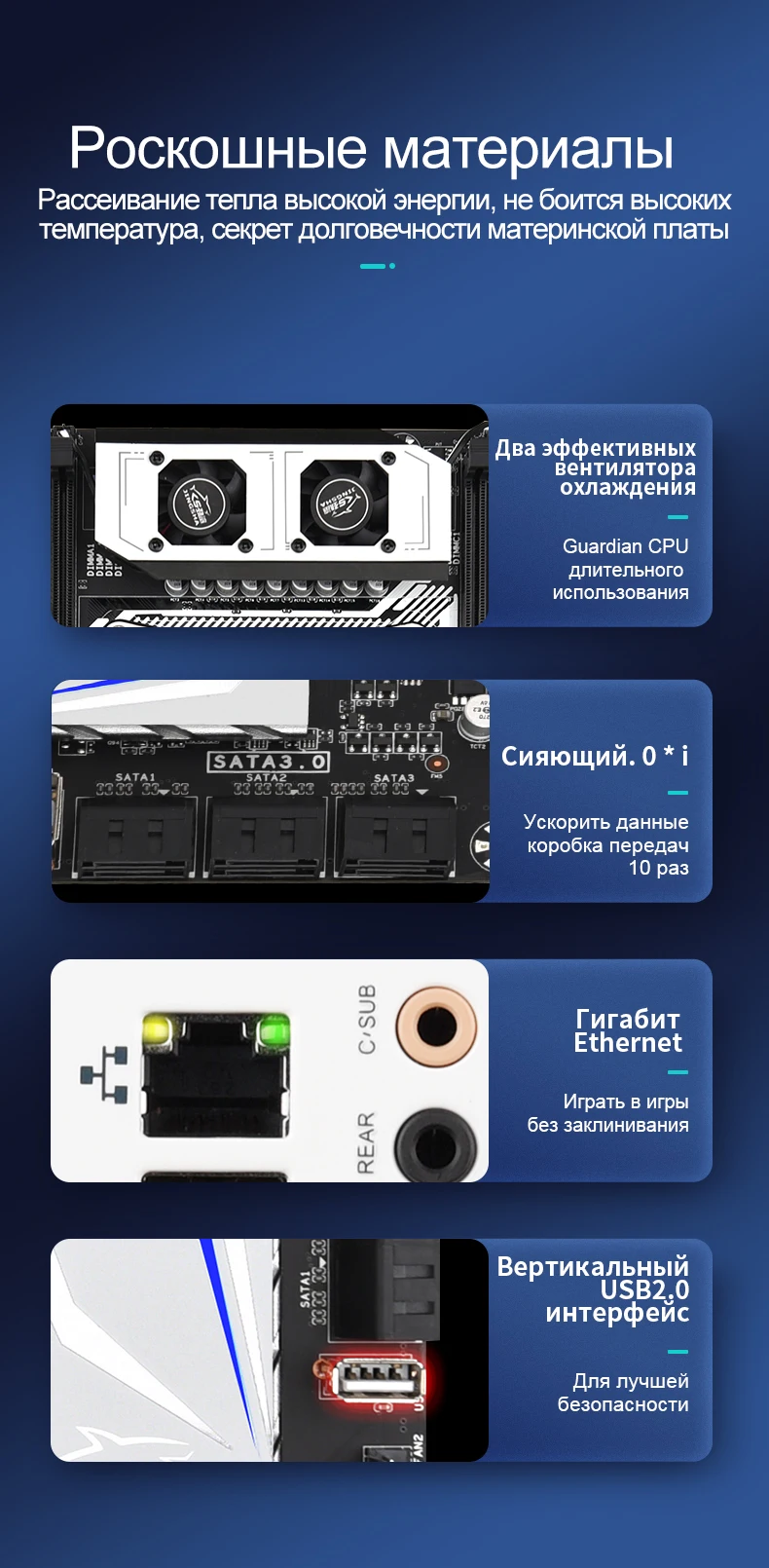 Доставка оперативная по заявленным срокам. Упаковка отличная, коробка целая, плата с антистатиком. На вид очень хорошего качества, текстолит, пластик, зона врм и вентиляторы визуально, как и ожидалось - отлично. Пока не могу проверить и прошить биос, но надеюсь, что все будет без бубенцов.