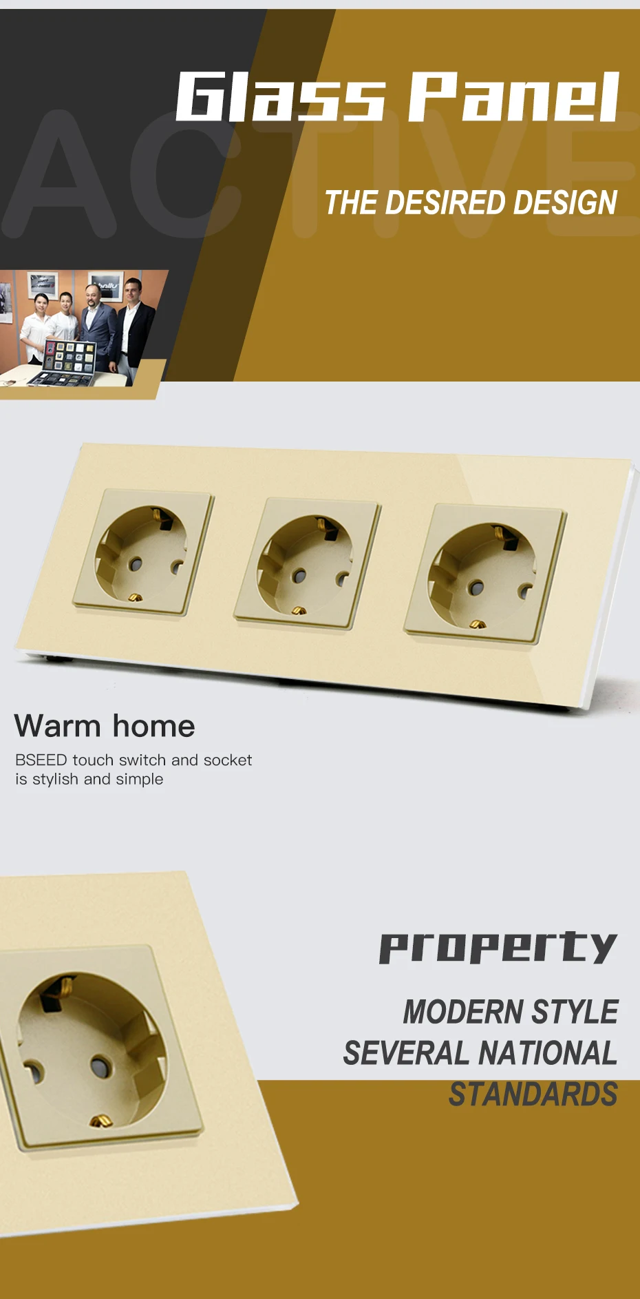 Европейские настенные розетки BSEED, розетки золотистые с двойной рамкой, тройные розетки класса со стеклянной панелью, защита для детей, 16 А