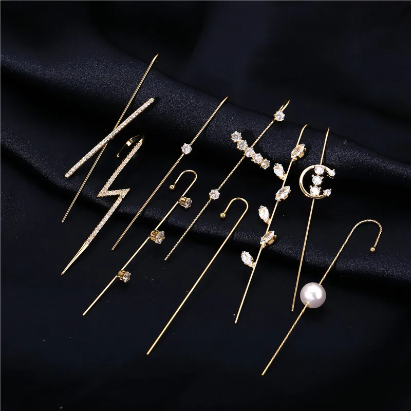 17 км 2 шт золотые Кристальные Асимметричные Висячие серьги для женщин молния цветок крюк серьги цепь уха альпинист Brincos Ювелирные Изделия