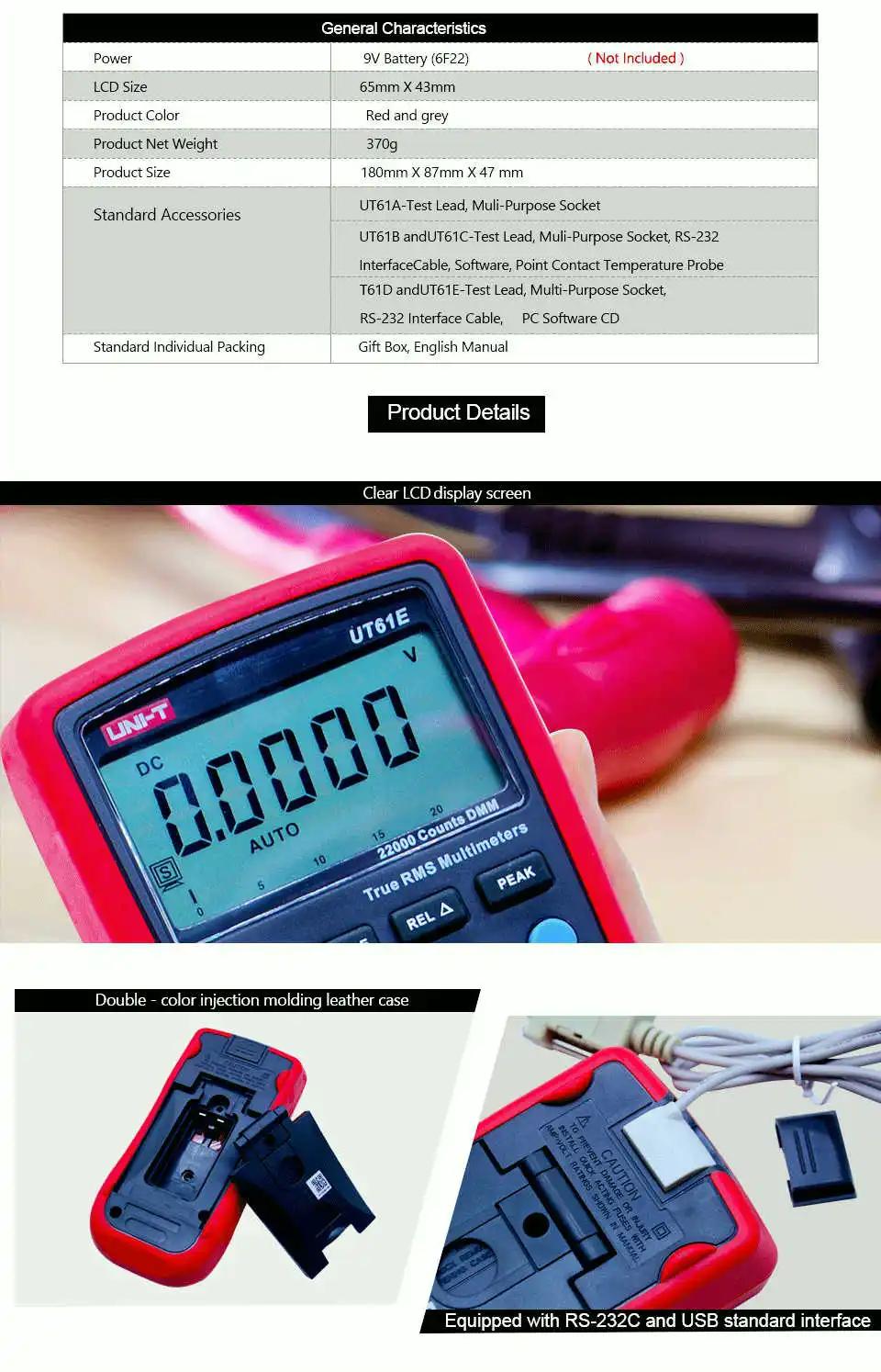 Посылка:1 * Цифровой мультиметр1 * Тестовые провода1 * Многоцелевой разъем1 * CD программное обеспечение (Ожидаемый UT61A)1 * RS-232 кабель (Ожидаемый UT61A)1 * точечный контактный датчик температуры (Ожидаемый UT61A UT61D UT61E)1 * Руководство пользователя на английском языке1 * цветная коробка