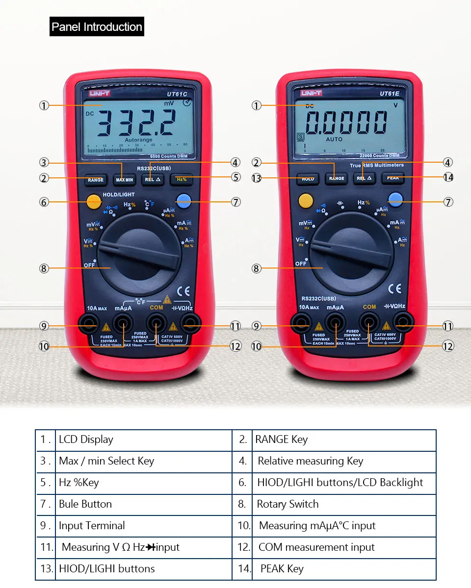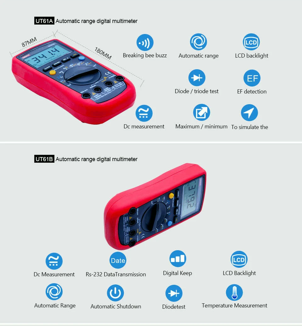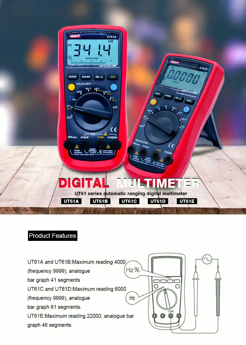 UT61 серия Введение:Цифровой мультиметр Модель UT61A, UT61B, UT61C,UT61D (True RMS) и UT61E (True RMS)Является автоматическим мультиметром. Конструкция корпуса принимает передовую технологию «co-инъекции», чтобы обеспечить достаточную изоляцию. Измеритель может измерять напряжение переменного/постоянного тока и сопротивление току, диод, непрерывный зуммер, емкость, частоту, температуру (C или F), функцию hFE и EF.Основные характеристики:1. UT61D/E являются истинными измерениями RMS2. Все модели имеют аналоговый бар3. Рабочий цикл до 0.1%-99.9%4. Автоматический диапазон и автоматическое отключение питания4. С RS-232 подключения к компьютеру для записи данных (за исключением UT61A)5. Хранение данных и максимальное/смешанное измерение6. Входное сопротивление для DCV7. ЖК-дисплей обратно-светильник дисплей (за исключением UT61E)8. 22000 Счетный дисплей для UT61E,6000 Счетный дисплей для UT61C & D,4000 Счетный дисплей для UT61A & B9. Измерение слабых сигналов10. Непрерывный звуковой сигнал11. Диапазон измерения температуры-40 °C ~ 1000 °C/-40 °F ~ 1832 °F (только UT61B и UT61C)Параметры:Напряжение постоянного тока для UT61A:400 мВ/4 в/40 В/400 В/1000 вDC Напряжение для UT61B: 40мв/400мв/4В/40В/400V/1000VНапряжение постоянного тока для UT61C и UT61D:60 мВ/600 мВ/6 В/60 в/600 В/1000 вDC Напряжение для UT61E:220mV/2,2 V/22В/220V/1000VНапряжение переменного тока для UT61A:400 мВ/4 в/40 В/400 В/750 ВНапряжение переменного тока для UT61B:40 мВ/400 мВ/4 в/40 В/400 В/750 ВНапряжение переменного тока для UT61C и UT61D:60 мВ/600 мВ/6 В/60 в/600 В/750 ВAC Напряжение для UT61E:220mV/2,2 V/22В/220V/750VПостоянный ток для UT61A и UT61B:400 μA/4000 μA/40mA/400mA/4A/10AПостоянный ток для UT61C и UT61D:600 μA/6000 μA/60mA/600mA/6A/10AПостоянный ток для UT61E:200 μA/2200 μA/22mA/220mA/2.2A/10AПеременный ток для UT61A и UT61B:400 μA/4000 μA/40mA/400mA/4A/10AПеременный ток для UT61C и UT61D:600 μA/6000 μA/60mA/600mA/6A/10AПеременный ток для UT61E:200 μA/2200 μA/22mA/220mA/2.2A/10AСопротивление для UT61A и UT61B:400Ω/4k Ω/40k Ω/400k Ω/4M Ω/40MΩСопротивление для UT61C и UT61D:600Ω/6k Ω/60k Ω/600k Ω/6M Ω/60MΩСопротивление для UT61E:220Ω/2.2k Ω/22k Ω/220k Ω/2.2M Ω/22M Ω/220MΩЕмкость для UT61A и UT61B:40nF/400nF/4 мкФ/40 мкФ/400 мкФ/4000 мкФЕмкость для UT61C и UT61D:40nF/400nF/4 мкФ/40 мкФ/400 мкФ/4000 мкФЕмкость для UT61E:22nF/220nF/2.2 мкФ/22 мкФ/220 мкФ/2.2mF/22mF/220mFЧастота для UT61A и UT61B:10 Гц-10 МГцЧастота для UT61C и UT61D:10 Гц-10 МГцЧастота для UT61E:10 Гц-220 МГц