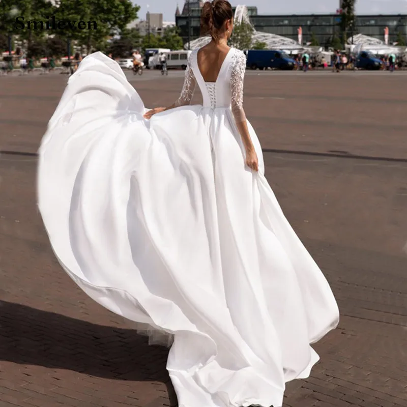 Женское атласное платье Smileven, элегантное мусульманское свадебное платье с рукавом 34 и объемным цветком, с закрытой спиной, 2021