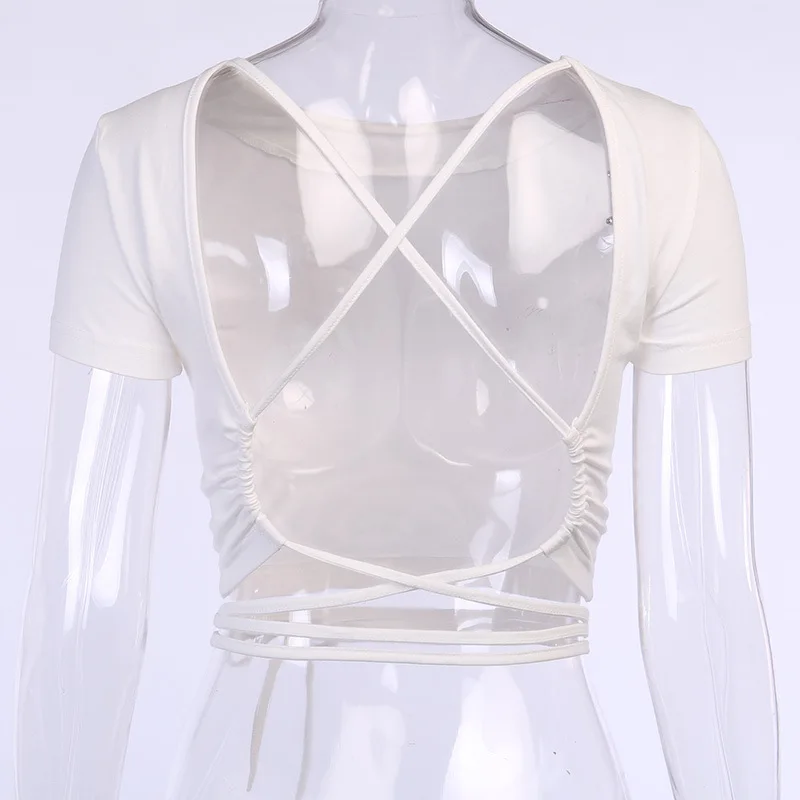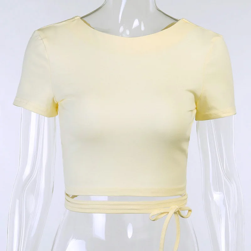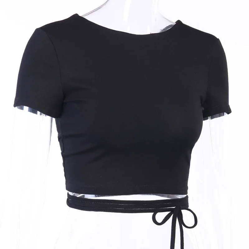 Модные летние однотонные футболки на шнуровке, сексуальная Базовая футболка, приталенные женские укороченные топы, уличная одежда, женские топы с вырезом на спине