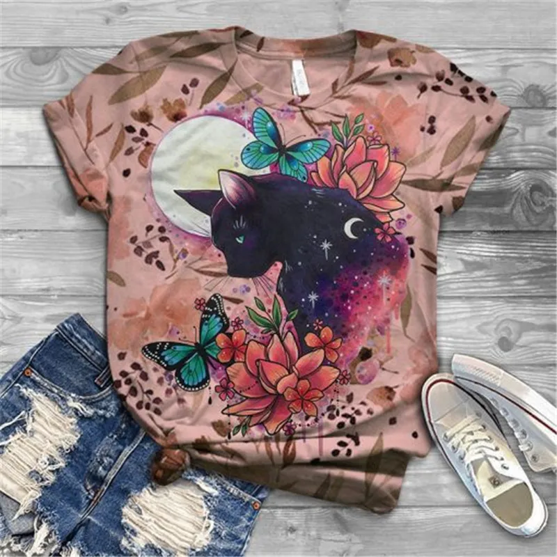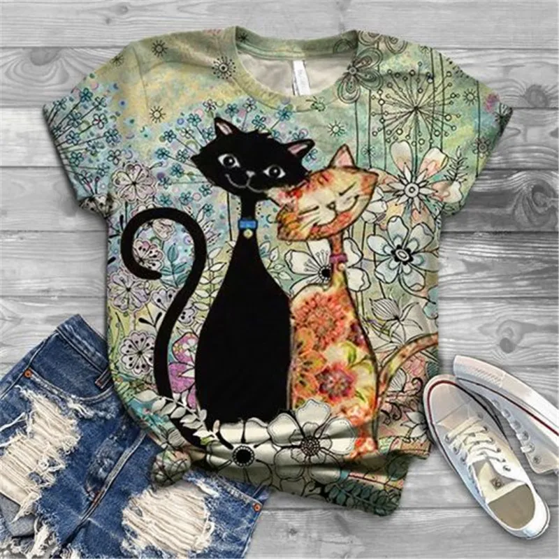 Летняя модная одежда, футболки с графическим рисунком кошки, женски...