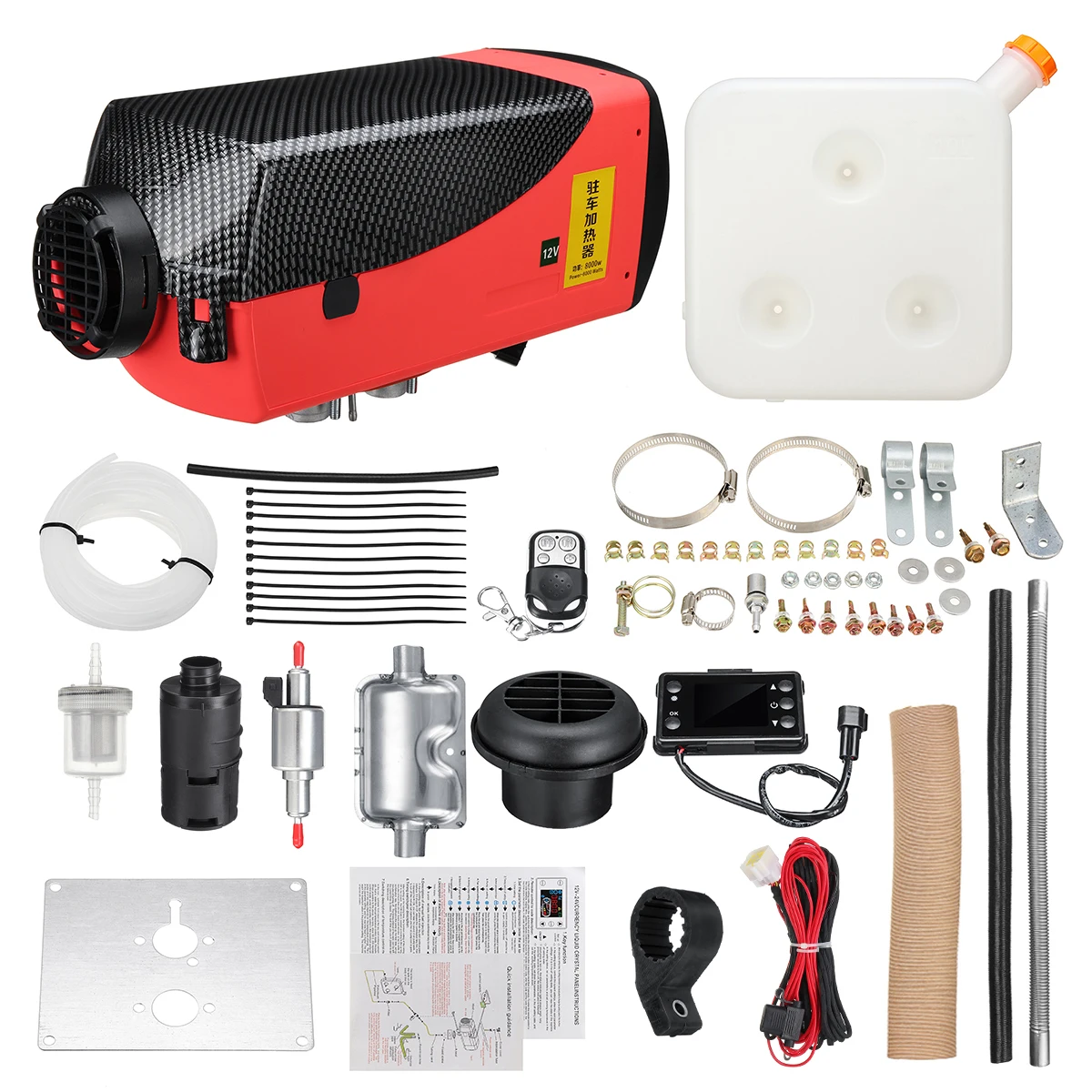 Посылка включает в себя:1 x Воздушный обогреватель1 х Красный 4-туннель пульт дистанционного Управление1 x Красный ЖК-термостат1 х глушитель1 бак (10 л)1 х проволочный пучок1 x вентиляционное отверстие1 х воздуховодная труба1 х впускная труба1 х выхлопная труба1 х масляный насос1 x фиксированная пластина1 х белая масляная труба1 x насадка для масла1 x крепеж1 комплект установки