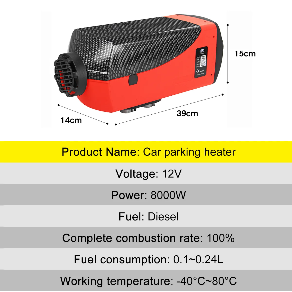 Название: 12V 8 кВт Дизельный подогреватель воздуха комплектХарактеристики:Материал: металл + пластикЦвет: черный текстура углеродного волокна и красныйРазмеры: 390 × 150 × 140 мм (15 × 6 × 5,5 ")Напряжение: 12 ВМощность: 8000 ВтТопливо: ДизельПолный коэффициент сгорания: 100%Расход топлива: 0,1 ~ 0,24 лРабочая температура: -40 °C ~ 80 °C