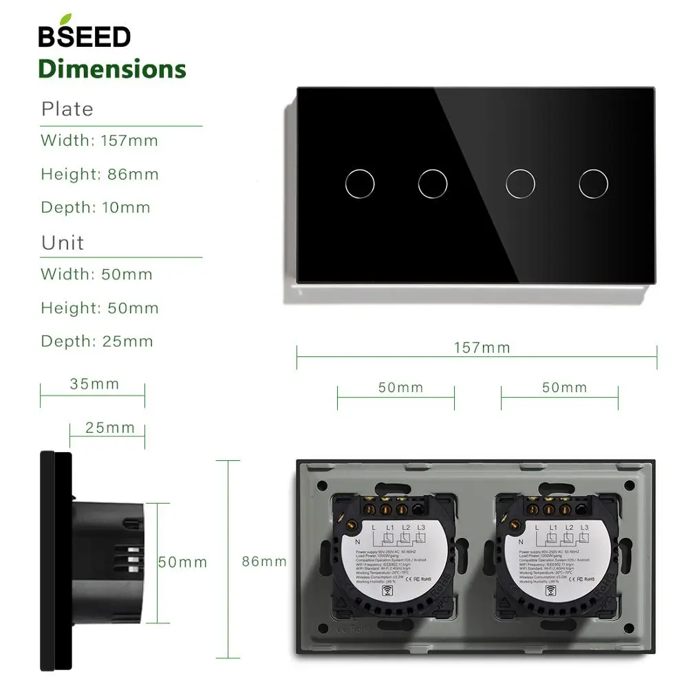 Настенный сенсорный выключатель BSEED, двойной выключатель с Wi-Fi, управление через приложение Google Alexa, 4 клавиши, 123 каналов
