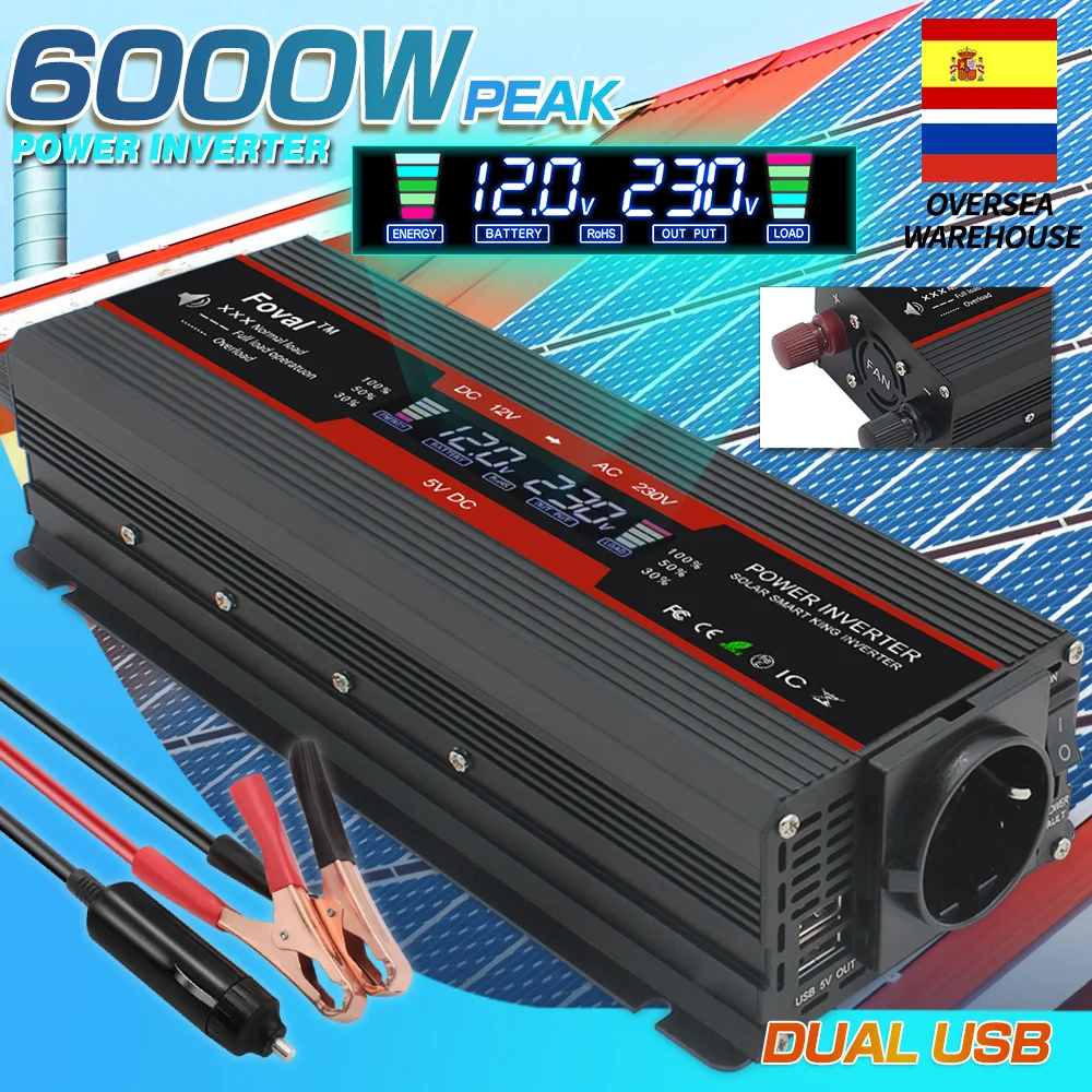 Инвертор мощности 6000 Вт, с ЖК-дисплеем, преобразователь с двумя USB-портами переходник для солнечных батарей в постоянного тока в 220 В переменного тока, модифицированный синусоидальный сигнал, европейская розетка
