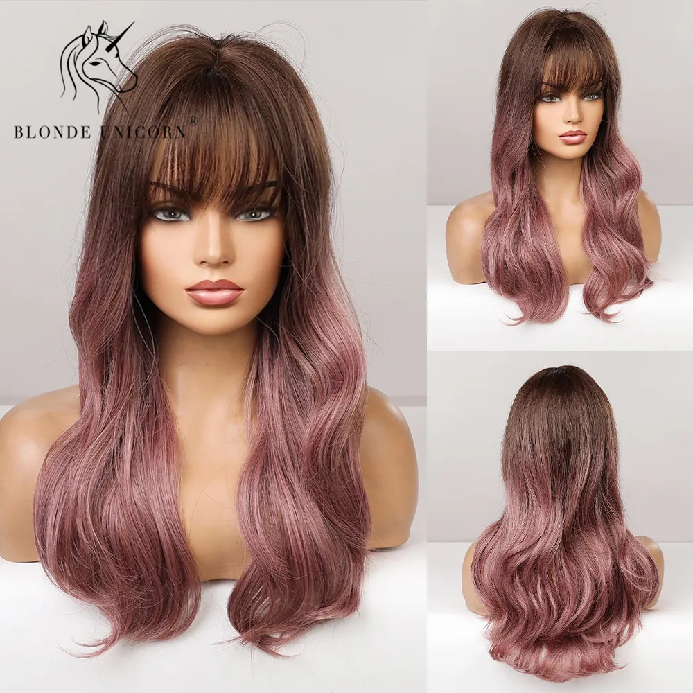 Парик с челкой для женщин, Длинные Синтетические натуральные волнистые волосы цвета блонд, единорог, Омбре, бордовый, красный, с челкой, из термостойкого волокна