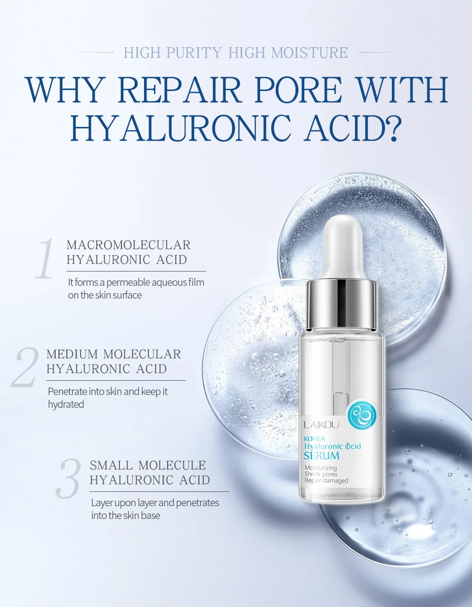 Зачем восстанавливать поры с помощью HY AI мочевой кислоты?1. Макромолекулярная Гиалуроновая кислотаTorms a Проницаемый aqueousfim на носке2. Средняя молекулярная Гиалуроновая кислотаПроникайте в грех и keepit hydnated3. Небольшая молекула гиалуроновой кислотыСлой uponayerand проникает в основание кожи