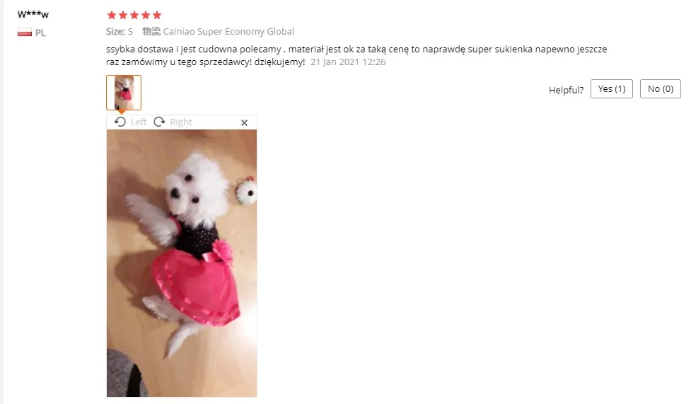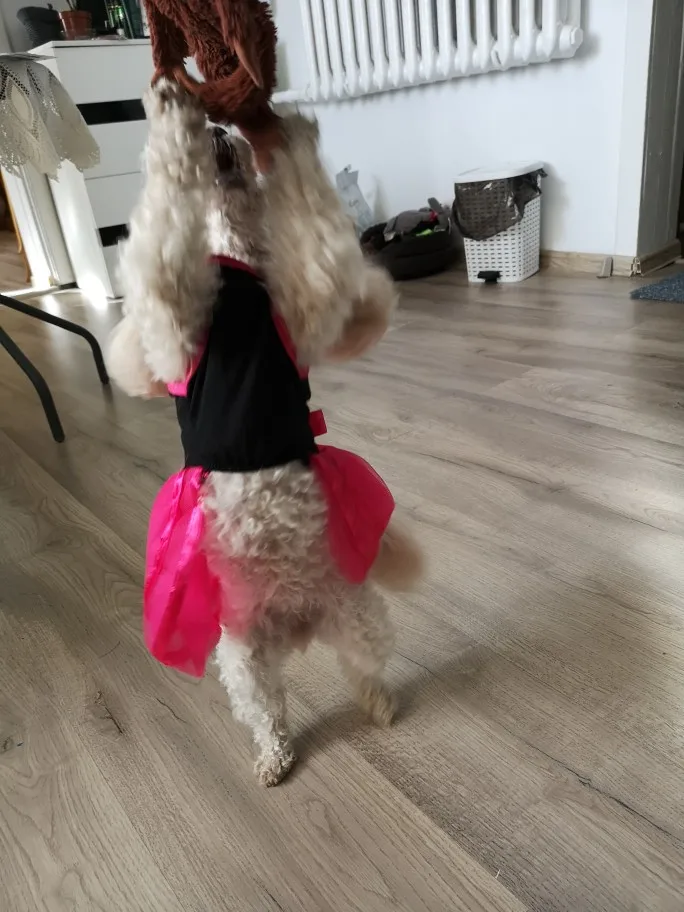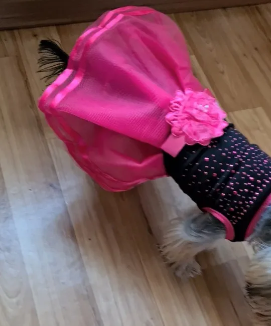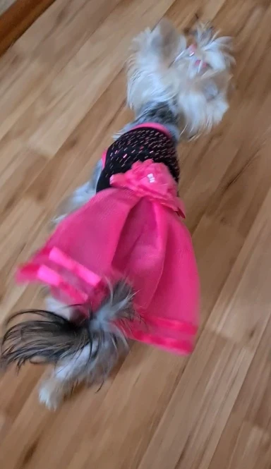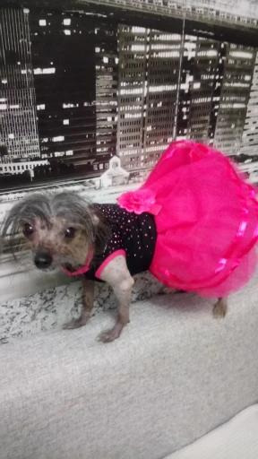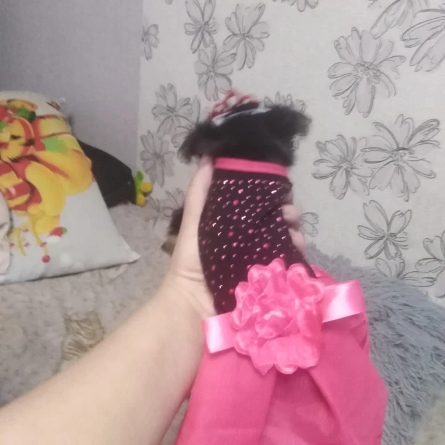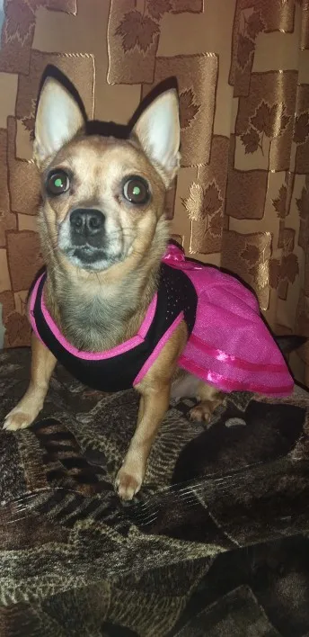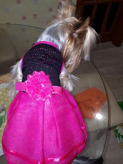 Доставка быстрая - 17 дней, объединили с другими посылками. Платье очень красивое, но сама сетка жёсткая, а платье синтетика. Платье маломерит. На худенького Йорка 3,6кг с длинной спинки 33 см платье впритык по объему, но по длинне хорошо. Обычно если мы берем М, то нам в объеме хорошо, а по длинне коротко, а если берем L , то хорошо по длинне, но велико по объему. Здесь все хорошо. К праздникам готовы))))