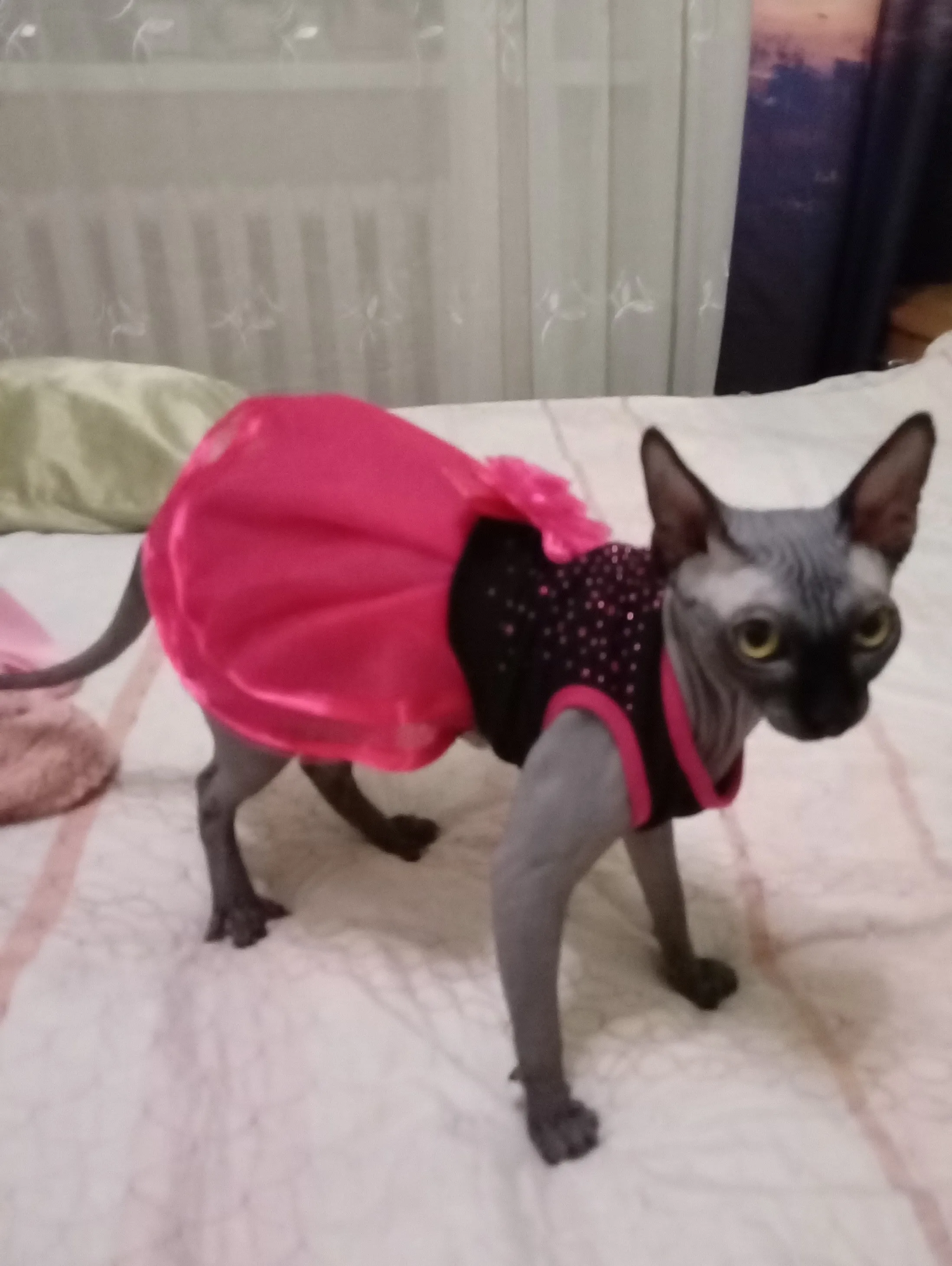 Интересное платьице. Кошечка спокойно бегает, хотя до этого не носила одёжку. Лёгкое, воздушное, нарядное.