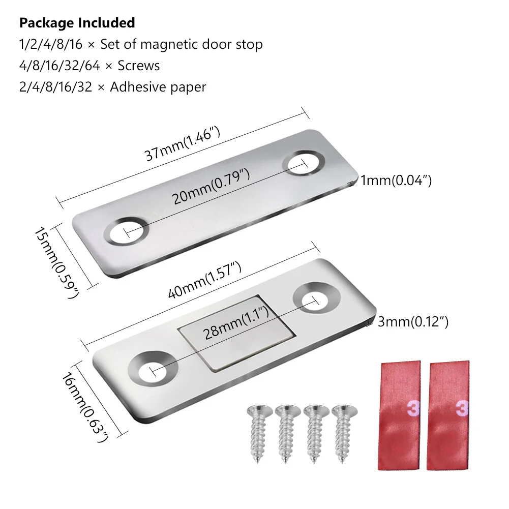 Самоклеящееся или винтовое крепление. Прочная клейкая паста для установки магнитных фиксаторов (экономия времени и отсутствие вреда для шкафа или двери), винтовое крепление предусмотрено для второго выбора.