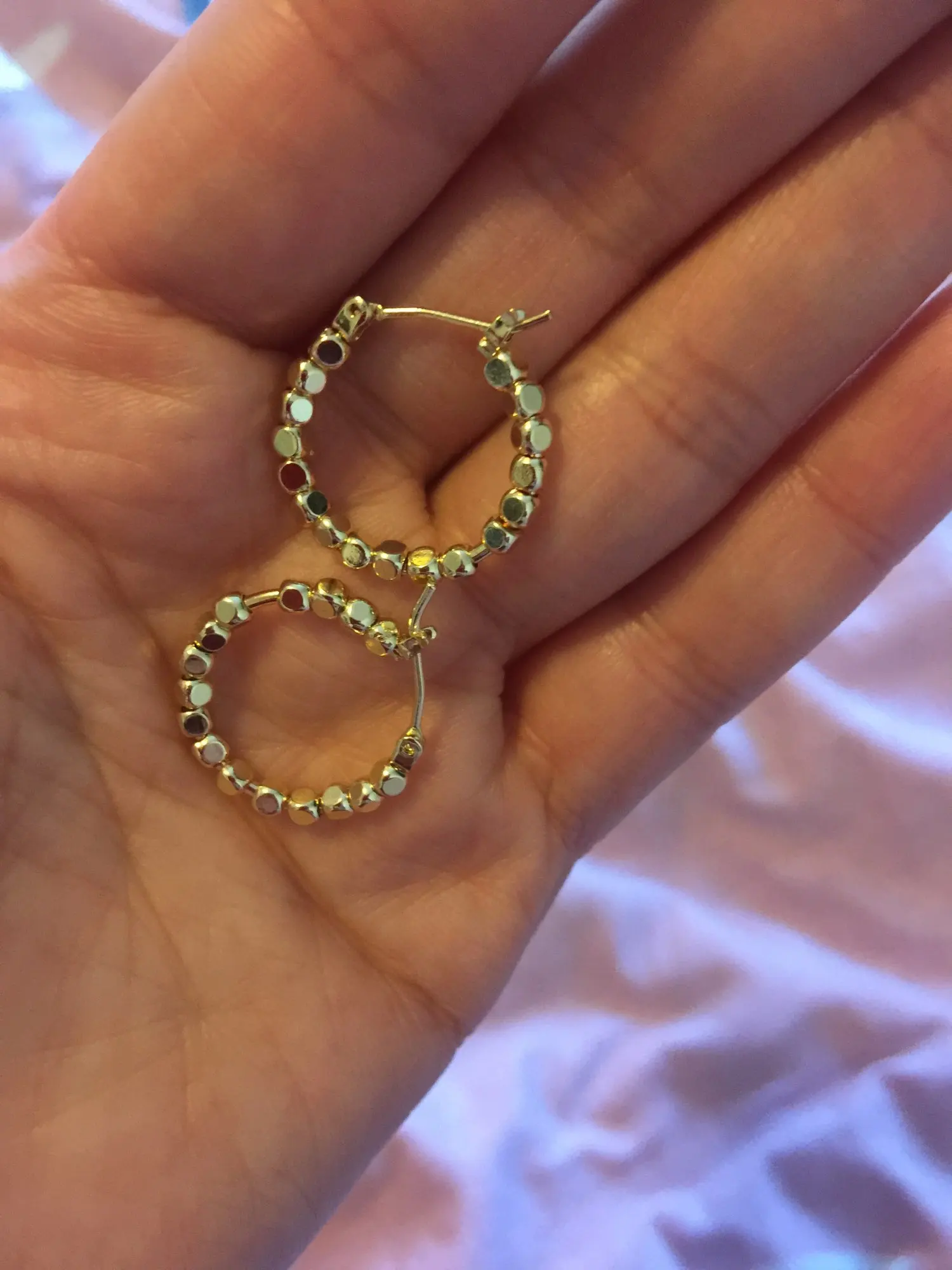Ok earrings, too small for a hoop earrings. Also one of the earrings is faulty with three loose balls moving around in the right ear. Anyway, the delivery was fast.