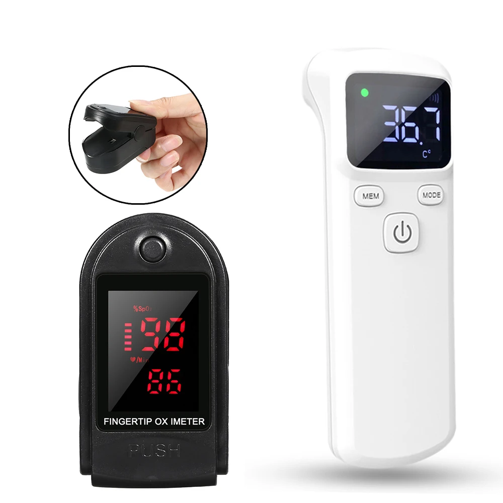 Инфракрасный термометр и Пальчиковый пульсоксиметр.[Инфракрасный термометр]Особенности:Инфракрасное измерение: Быстрый максимально возможной величине стопы 0,5 во-вторых. Точный и надежный с модернизированным алгоритмом и оптимизированной калибровкой температуры.Функция памяти: 32 группы данных измерений памяти, легко запоминаются.Светодиодный дисплей: большой экран с подсветкой, простой для чтения даже в темноте.Энергосбережение: он будет выключен автоматически в 6S, если нет операции.Универсальный: по Цельсию и по Фаренгейту блок опционально, тело и объект режим измерения температуры доступен.Карманный дизайн: портативное устройство для переноски, Бесконтактный и Безопасный в использовании.Характеристики:Цвет: белыйМатериал: АБС-пластикЕдиница измерения: °C/ °FПамять: 32 группыРазрешение: 0,1 ℃Испытательное расстояние: 1-5 смАвтоматическое выключение: 6SСигнализация Температура окружающая Обстановка: 37,5 ℃ (значение по умолчанию)Диапазон измерения: 32,0 ℃-42,9 ℃ (89,6 ℉-109,2 ℃)Точность:± 0,2 ℃: 35,0 ℃-42,0 ℃ (95,0 ℉-107,6 ℃)± 0,3 ℃: 32,0 ℃-34,9 ℃ (89,6 ℉-94,8 ℃)/42,1 ℃-42,9 ℃ (107,8 ℉-109,2 ℃)Экран: светодиодныйРабочая Влажность: 15%-85%Рабочая температура: 16 ℃-35 ℃Температура транспортировки и хранения. : -20 ℃ ~ 55 ℃Питание: 2*1,5 V AAA батареи (не входит в комплект)Товар Размеры: 3,6*3,4*13,6 см/1,42*1,34 * 5.35inВес изделия: 50 г/1,76 унцийРазмер посылка: 16,0*5,0*3,8 см/6,30*1,97*1,50 дюймовПосылка Вес: 100g/3,53 oz[Пульсоксиметр пальцевого наконечника]Особенности:Надежный и быстрый: Пульсоксиметр для кончика пальца определяет насыщенность кислорода в течение 5 секунд.Высокопроизводительные датчики: мощные датчики ускорения для достижения более точных результатов измерений.Чип низкой мощности: он использует чип низкой мощности, который может увеличить время использования и обеспечить производительность.Большой светодиодный дисплей с высоким разрешением: подсветка A-level, большой шрифт, высокое разрешение, подходит для пожилых людей.Нескользящая и устойчивая к царапинам: с УФ-технологией, по сравнению с обычными материалами, она предлагает отличные технологии.Универсальный: для пилотов, любителей спорта, лыжников, велосипедистов или альпинистов насыщенность кислородом может быть быстро и легко прочитана.Характеристики:Материал: АБС-пластикЦвет: синийНасыщение кислородом: 36%-99% (± 2%)Источник питания: 2 * батарейки типа "ААА" (не входит в комплект)Рабочий ток: 20mA-120mAТовар Размеры: 5,5*3,2*3,0 см/2,2*1,2 * 1.3inВес изделия: 50 г/1,76 унций (с батареями)Посылка Размеры: 6,9*6,3*4 см/2,72*2,48 * 1.57inВес посылка: 56 г/1,96 унцийПосылка:1 * термометр1 * оксиметр1 * ремешок2 * Руководство пользователя