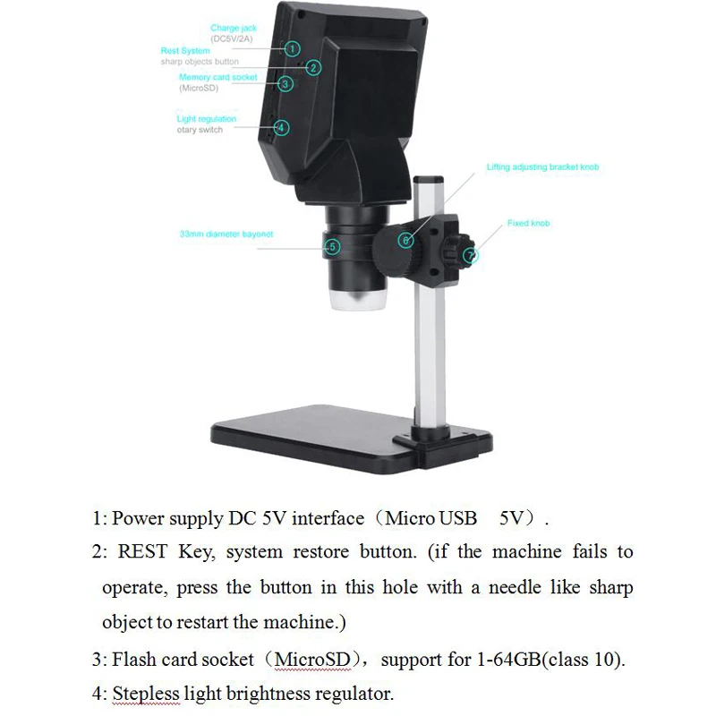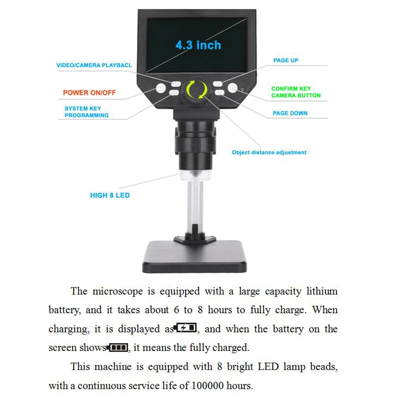 Описание: 4,3 дюймовый ЖК-экран высокого разрешения G1000 микроскоп, кронштейн можно поворачивать в соответствии с вашими потребностями, в то время как объектив поддерживает 1-1000X непрерывного увеличения. Он определенно может стать прекрасным помощником для вашей повседневной работы. Особенности: Это цифровой микроскоп с непрерывным зумом и широким спектром наблюдений. Увеличение от 1 до 1000 раз, вы всегда можете найти подходящее кратное, чтобы увидеть объект. Увеличение: от 1 до 1000 раз система непрерывного усиления. Видео можно сохранять на карту флэш-памяти (карта в комплект не входит). Расстояние объекта: 10 мм до бесконечности (разные расстояния объекта соответствуют разным кратным). Встроенная литиевая батарея может работать непрерывно 4-6 часов. Шестнадцать языковых систем: английский, испанский, русский, корейский, японский, тайский, иврит, Португалия, немецкий, французский, Италия, Турция, чешский, Польша, традиционный китайский и упрощенный китайский. Он подходит для широкого спектра отраслей: контроль качества различных видов заводов, учебные пособия по различным предметам, наблюдение за кожей и волосами, развитие интересов и увлечений детей, идентификация ювелирных изделий и бриллиантов, печатных плат, высокоточного оборудования, биологии, минералов, печати, ткани, старины. Этот продукт был усовершенствован в отношении проблемы высокого отражения, это цифровой микроскоп, который может регулировать угол. Данная машинка оснащена 8 яркими светодиодный ными лампочками. Характеристики: Материал: ABS + металл Цвет: черный + серебристый Материал кронштейна: алюминий + пластик, Пиксели: 8 миллионов пикселей высокое разрешение Экран дисплея: 4,3 дюймовый ЖК-дисплей высокой четкости Увеличение: 1-1000 раз система непрерывного усиления Видео можно сохранить на карту флэш-памяти (Используйте карту класса 10 speed, карта не входит в комплект). Расстояние объекта: 10 мм до бесконечности (различные расстояния объекта соответствуют разным кратным.) Аккумулятор: 1 * литиевый аккумулятор, 2500 мАч (входит в комплект) Время работы: 4-6 часов Время зарядки: 6-8 часов Шестнадцать языковых систем: английский, испанский, русский, корейский, японский, тайский, иврит, Португалия, немецкий, французский, Италия, Турция, чешский, Польша, традиционный китайский и упрощенный китайский. Количество СВЕТОДИОДНЫЙ ных лампочек: 8 ярсветодиодный ных лампочек Посылка: 210*170*90 мм/8,3*6,7 * 3.5in Вес посылка: 520 г/1.1lb Детали работы машины: Настройка разрешения: (Высокое разрешение. F-Высокое разрешение) Качество изображения: 1 м, 2 м, 3 м, 5 м, 6 м, 8 м Циклическая съемка камерой: 3 минуты, 5 минут, 10 минут Баланс белого: автоматический, солнечный свет, облачный, Вольфрамовая Лампа накаливания, люминесцентная лампа Компенсация экспозиции: 2 + 1 + 0 -1 -2 Отметка времени: вкл/выкл Установка времени: год, месяц и день Автоматическое отключение: Выкл., 3 минуты, 5 минут, 10 минут Язык: английский, испанский, русский, корейский, японский, тайский, иврит, Португалия, немецкий, французский, Италия, Турция, чешский, польский, традиционный китайский, упрощенный китайский Частота переменного тока: 50 Гц/60 Гц Автоматическое выключение экрана: Выкл, 3 минуты, 5 минут, 10 минут Формат: OK, отменить Сброс системы: да/нет Комплектация: 1x G1000 микроскоп 1x кронштейн 1x кабель передачи данных 1x Руководство пользователя