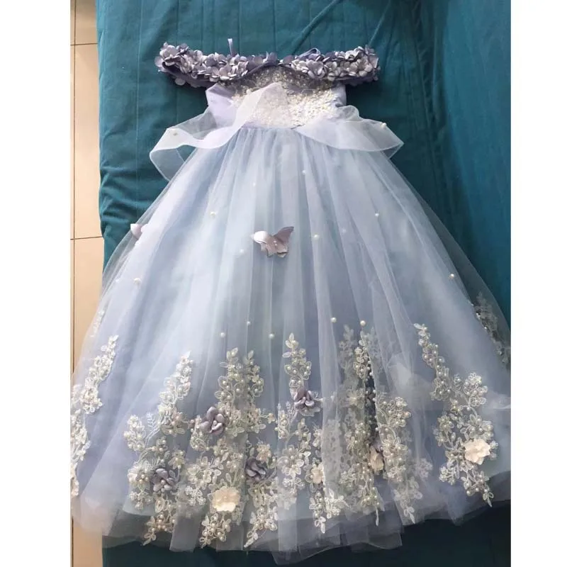 Светильник но-голубое платье принцессы с жемчугом и цветами, платья для свадебных торжеств, платье в пол из тюля для первого причастия