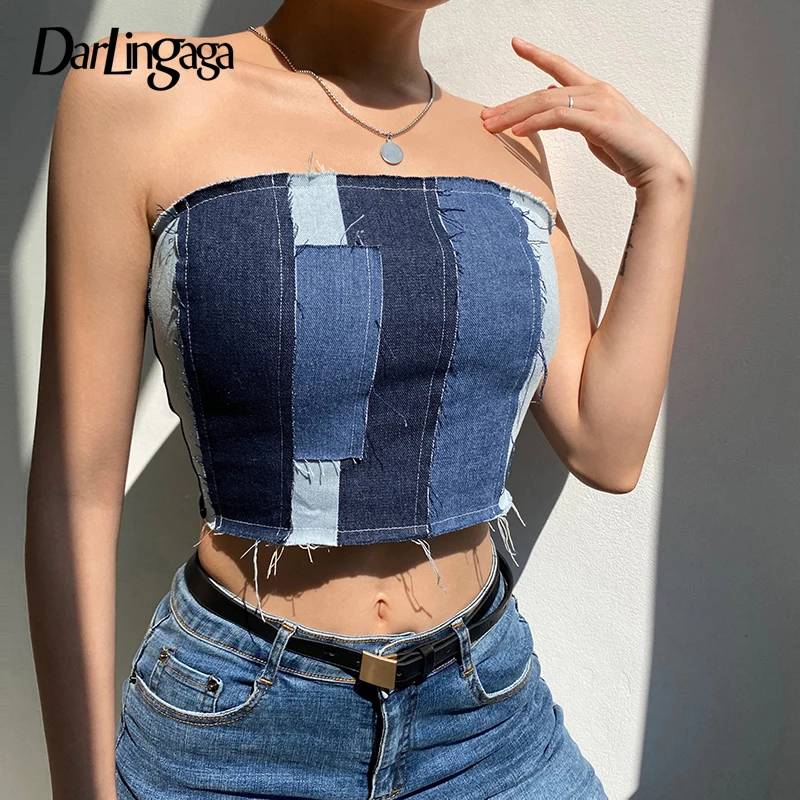 Женский укороченный топ Darlingaga, облегающий джинсовый топ с открытыми плечами, контрастный топ-бандо, лето 2019