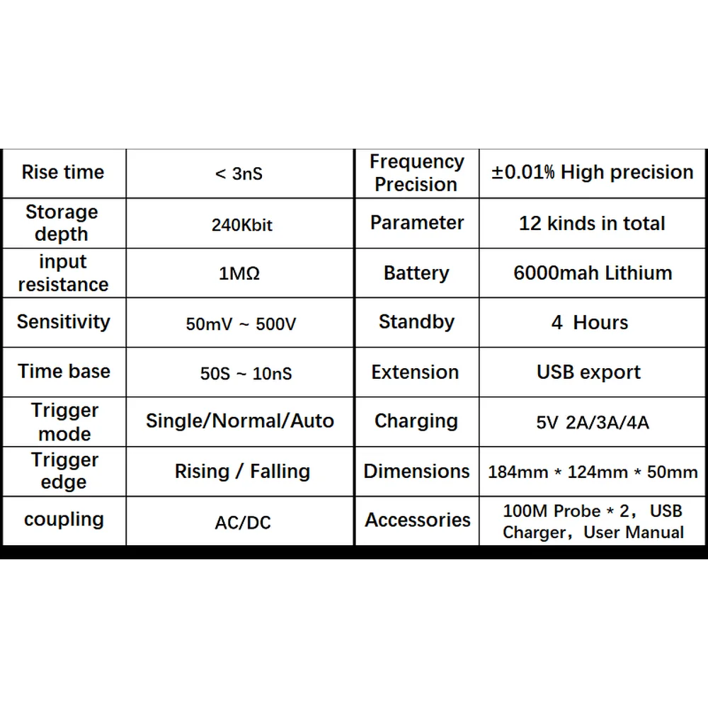 FNIRSI-1013D-это полнофункциональный, практичный, экономичный двухканальный плоский осциллограф, запущенный FNIRSI для обслуживания и R & D промышленности; этот осциллограф имеет частоту дискретизации в реальном времени 1GSa / s и аналоговую пропускную способность 100 МГц * 2. С полной функцией триггера (одиночный/Нормальный/автоматический), его можно использовать свободно для периодического аналогового сигнала или непериодического цифрового сигнала; встроенный модуль защиты высокого напряжения может выдерживать Непрерывное напряжение до 400 В. ДТП осциллографа, вызванный поворотом зонда в положение 10X. Режим Прокрутки с большой базой времени может контролировать изменения медленного уровня; Оснащен высокоэффективным одним ключом, который может отображать измеренную форму волны без утомительных настроек; дисплей с диагональю 7 дюймов 800*480 разрешение высокой четкости ЖК-дисплей Экран и метод работы конденсатор с алюминиевой крышкой, Экран сенсорный экран + жест операции, очень удобно; Функция измерения курсора, вам не нужно читать блок фоновой шкалы и количество при ручном считывании амплитудных и частотных параметров, и вы можете напрямую получить пиковую, пиковую и частоту без преобразования; чрезвычайно удобный скриншот и функция хранения сигналов, встроенный объем памяти 1 Гб, Может хранить до 1000 скриншотов + 1000 наборов данных волноводной формы, процесс хранения прост и быстр, сохраняет текущее состояние в любое время, в любом месте одним касанием, без громоздких подсказок и выбора, сохраняйте спокойствие, сохраняя текущие данные в месте, которое очень удобно; Мощный Графический менеджер поддерживает просмотр, просмотр, Детальный просмотр, поворот страницы, удаление и масштабирование формы волны, масштабирование, перемещение и т. Д., чтобы облегчить вторичный анализ. Фюзеляж оснащен интерфейсом USB, который может быть подключен к компьютеру, чтобы поделиться своими скриншотами с компьютером, что удобно для вторичного анализа; функция графического дисплея Lissajous может использоваться для определения амплитуды, частоты и фазового контраста двух групп сигналов; Анализ гармонических компонентов сигнала; Встроенный литий-ионный аккумулятор высокого качества 6000 мАч, который может работать в течение 4 часов при полной зарядке и может использоваться во время зарядки, как ноутбук
