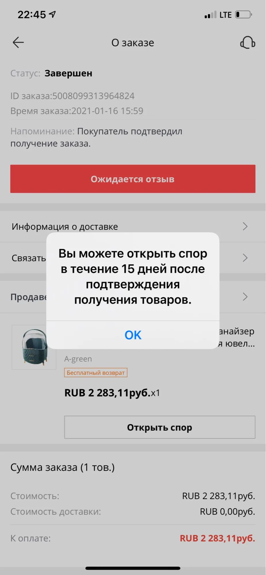 Посылка получена не была, меня обманули , спор открыть не могу, тк в приложении числится что посылка мною была получена... но она была возвращена отправителю. Отправитель разбираться не хочет! НЕ РИСКУЙТЕ! Не рекомендую заказывать в этом магазине.