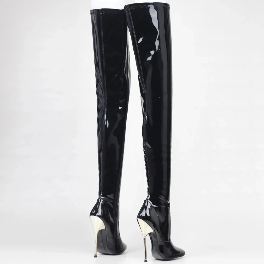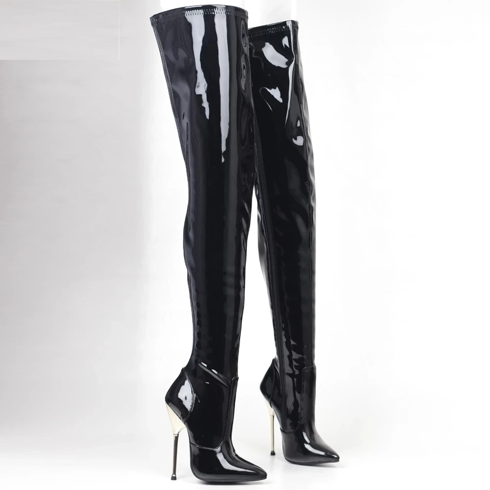 Женские сапоги выше колена, на очень высоком каблуке 18 см, с острым носком, на молнии, из искусственной кожи