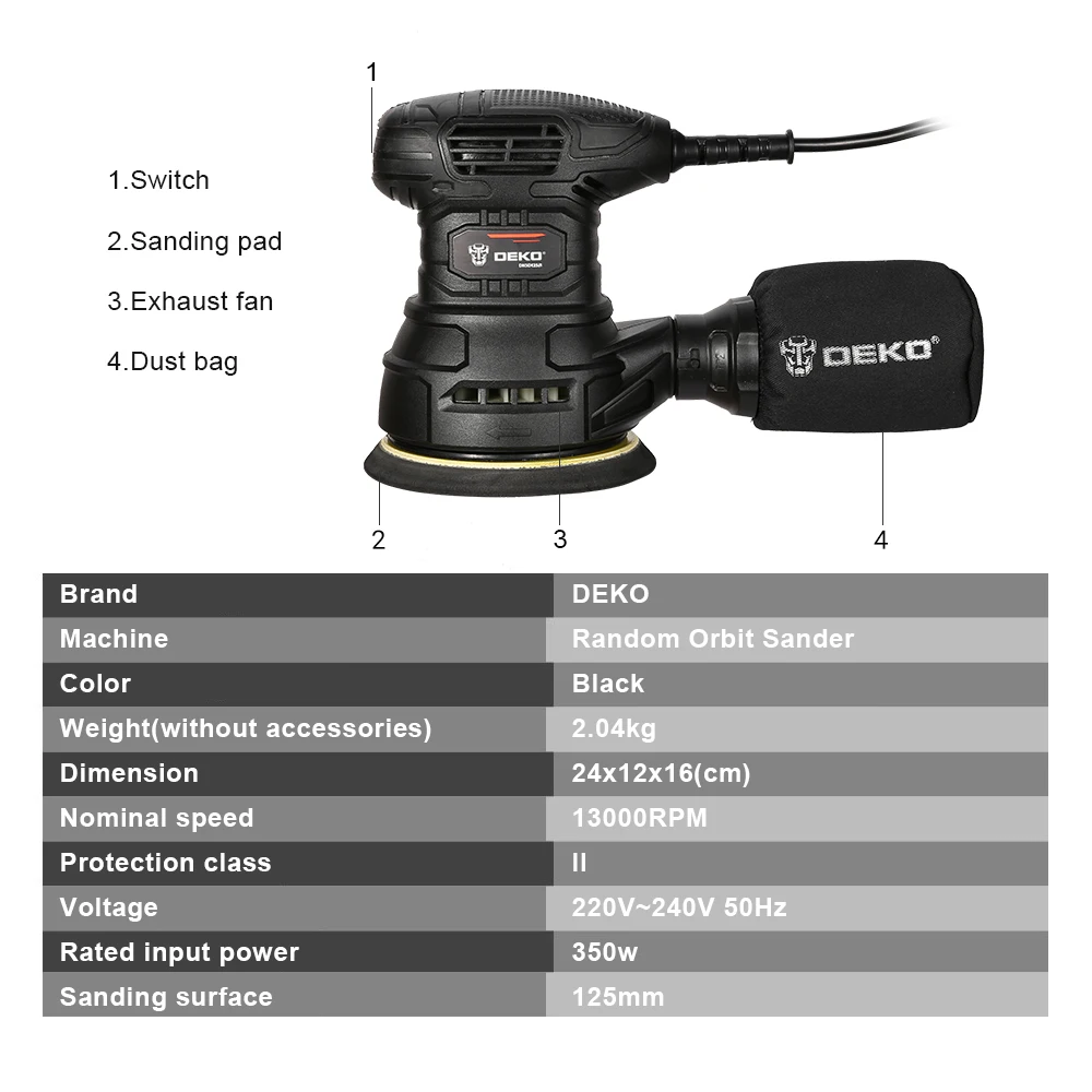 DEKO DKSD125J1, 350 Вт, случайный выбор орбитальная шлифовальная машина, с выхлопом пыли и гибридной канистрой для пыли