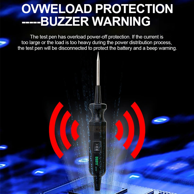 Тестовое перо имеет защиту от перегрузки и отключения питания. Если ток слишком большой или нагрузка слишком Тяжелая во время процесса распределения питания, тестовое перо отключается для защиты аккумулятора и подается звуковой сигнал