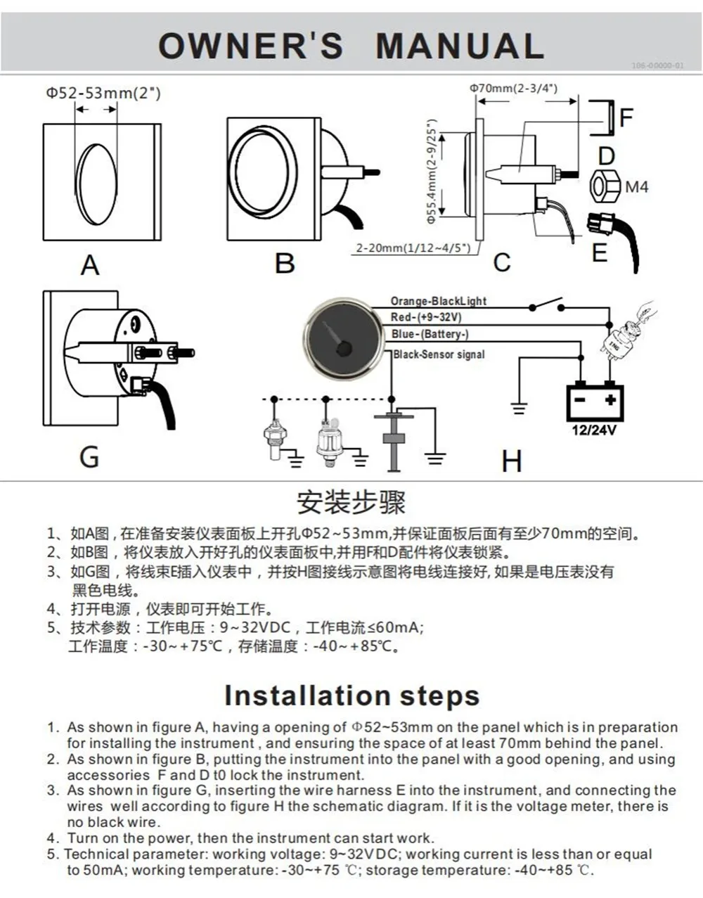 Диаметр установки: Φ52мм или 2-1/16"