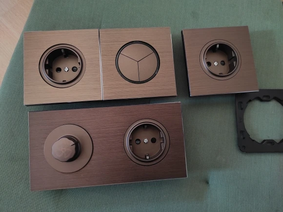 Фото плохо передаёт цвет панели. На свету она более рыжая, в тени - коричневая. Благородный медный отлив. Сами выключатели и розетки немного другого цвета нежели панели, но смотрятся не плохо. Конструкция на защёлках и после полной сборки снять такую розетку аккуратно будет невозможно. Подрозетники идеально подошли Kopos ku 68-1901, квадратные покупать не обязательно. У выключателя с одной кнопкой есть неприятный звон при щелчке, у двойного выключателя такого звона нет. В остальном, до сборки, претензий по качеству нет. Все розетки, панели и выключатели сделаны аккуратно и внешних дефектов не имеют.
