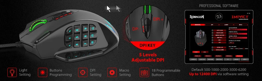 Мышь игровая Redragon M908 RGB со светодиодными боковыми кнопками, 12400DPI, 19 программируемых кнопок