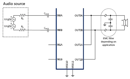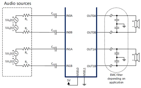 Положение1/Положение2 = 0/1 :2Одноканальный выход (SE)+ 1Выход канала полумоста (BTL), В это время выходная мощность каждого канала40 Вт, Выходная мощность канала полумоста80 ВтМетод подключения показан на рисунке ниже: