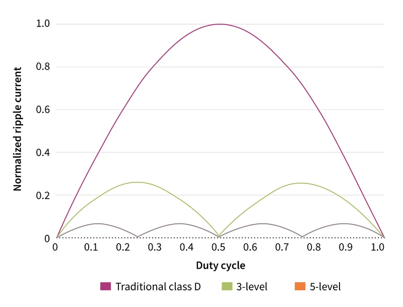 В полной мостовой нагрузке (BTL) конфигурации-то есть, сочетая два трехуровневых полумостов с режимами переключения, В тех случаях, когда источник постоянного тока с режимом переключения каждого полумостовой-фаза-сдвигается на 90 ° по отношению к другому, полученное уровень мощности, он может обеспечить 5-уровневая режим модуляции для по-разному подключен динамик нагрузки. Многоуровневая модуляция может производить более высокую выходную частоту, и каждый шаг напряжения меньше. По сравнению с традиционным усилителем класса D выходной звуковой сигнал ближе к входной форме сигнала.