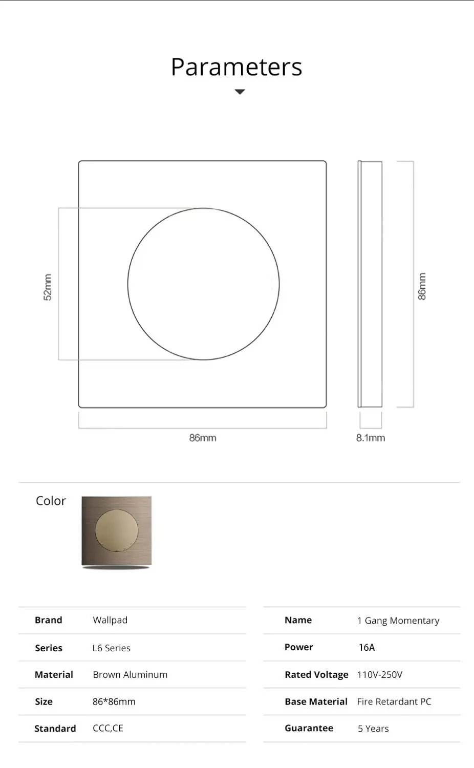 Wallpad L6 1 Gang быстродействующий кнопочный настенный выключатель для штор рулонные шторы коричневый матовый алюминиевый атласная металлическая панель