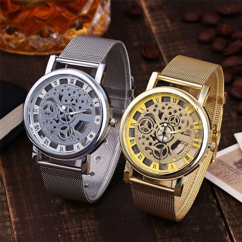 Мужские и женские наручные часы со скелетом, модные золотые наручные часы с сеткой из стали, часы reloj mujer, 2019