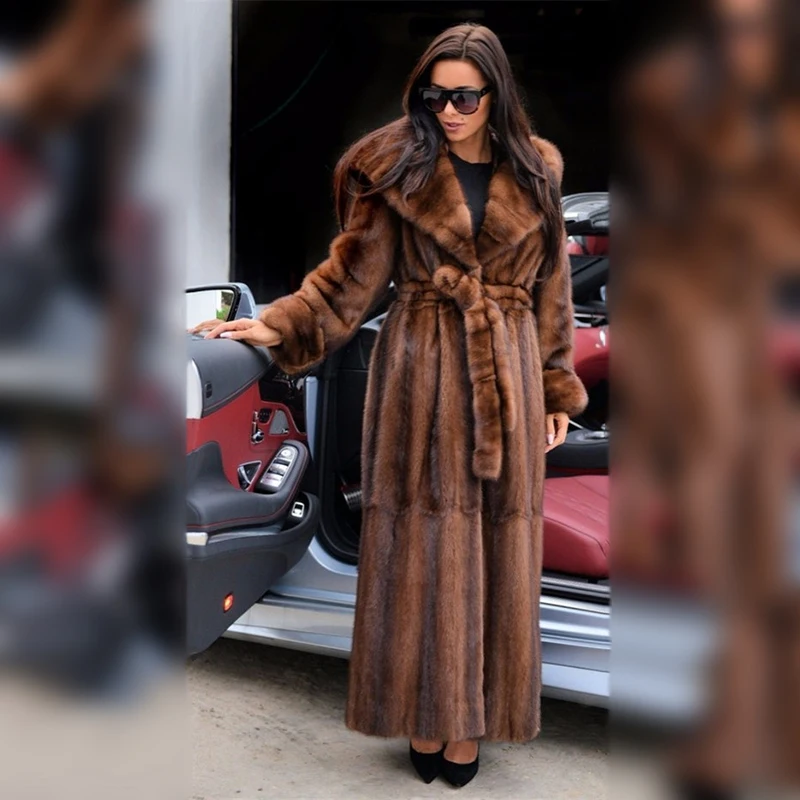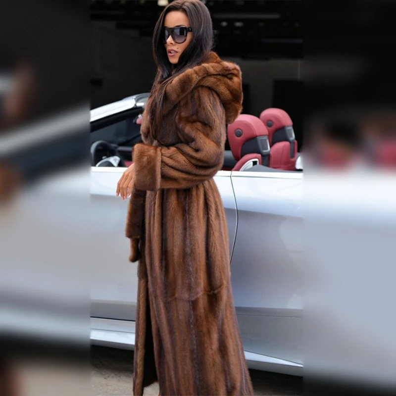Шуба женская из натурального меха норки, теплая шуба с капюшоном длиной 120 см, с тонким поясом, коричневая, Зимняя