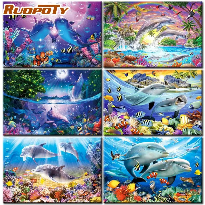 RUOPOTY 60x75 см рамка Дельфин DIY живопись по номерам животное ручная роспись Картина маслом животное холст окраска домашний декор