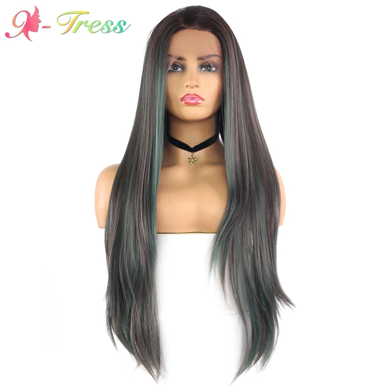 Длинные прямые парики 13x4 на фронтальной сетке для женщин X-TRESS серый зеленый цвет 29 дюймов Синтетические парики термостойкие парики для косплея Вечерние