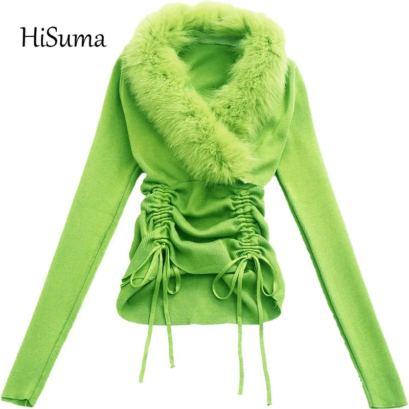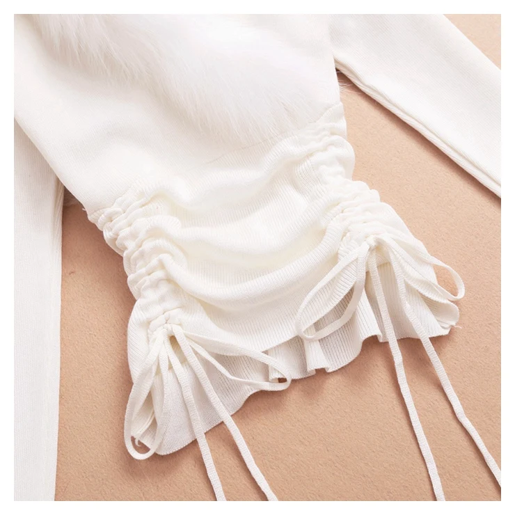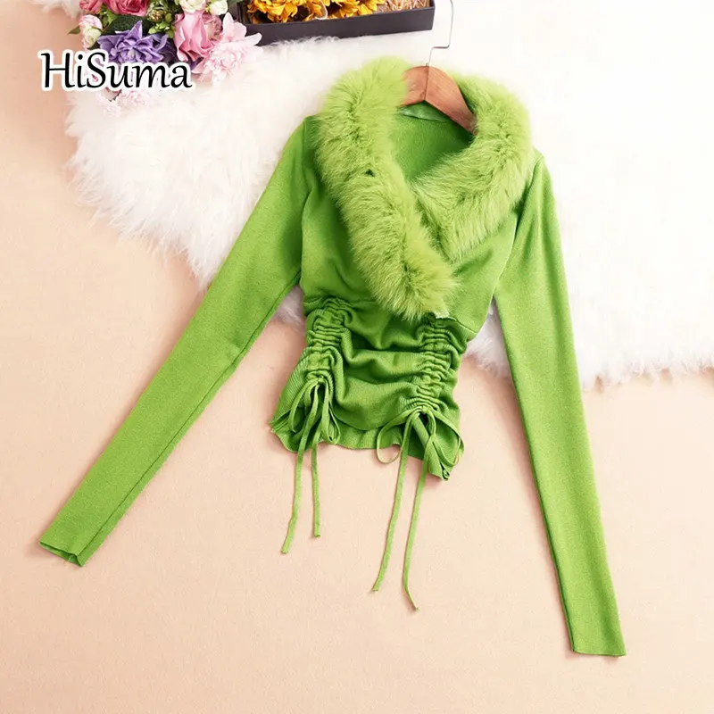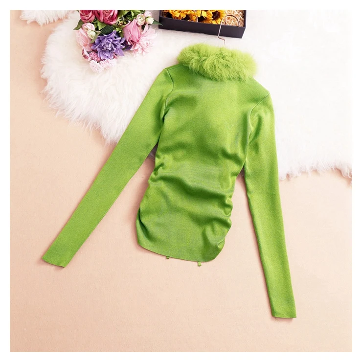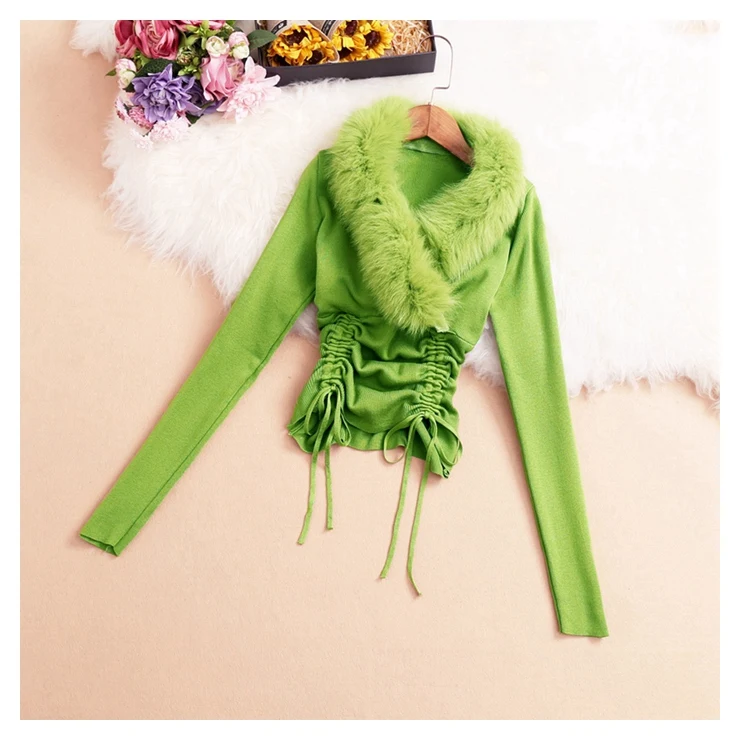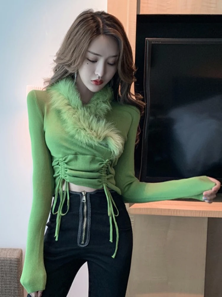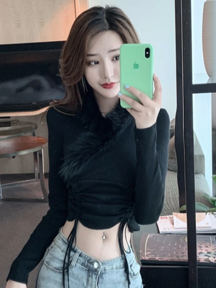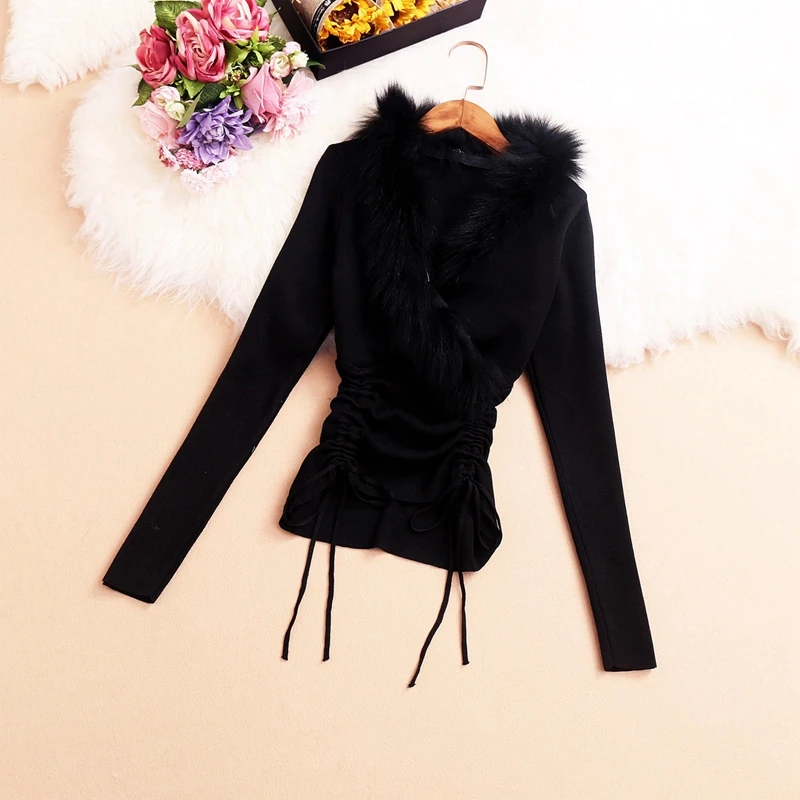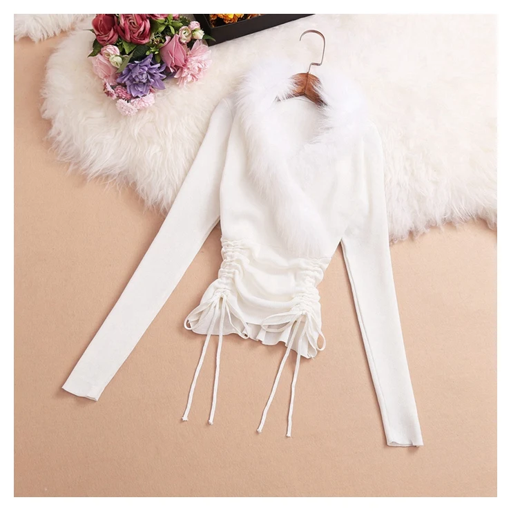 Женская трикотажная рубашка, с V-образным вырезом, длинным рукавом, кулиской и меховым воротником, весна 2021