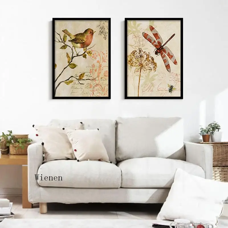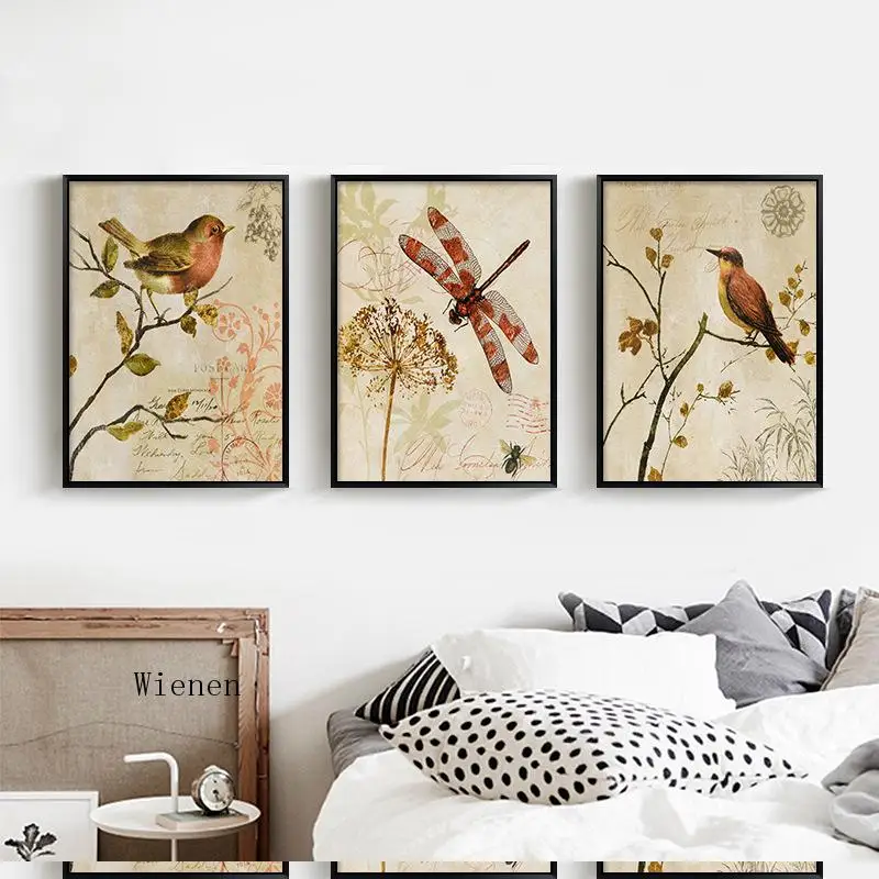 Картина на холсте с изображением акварельных птиц на дереве, Триптих, американский винтажный постер с рисунком животных, Настенная картина, домашний декор