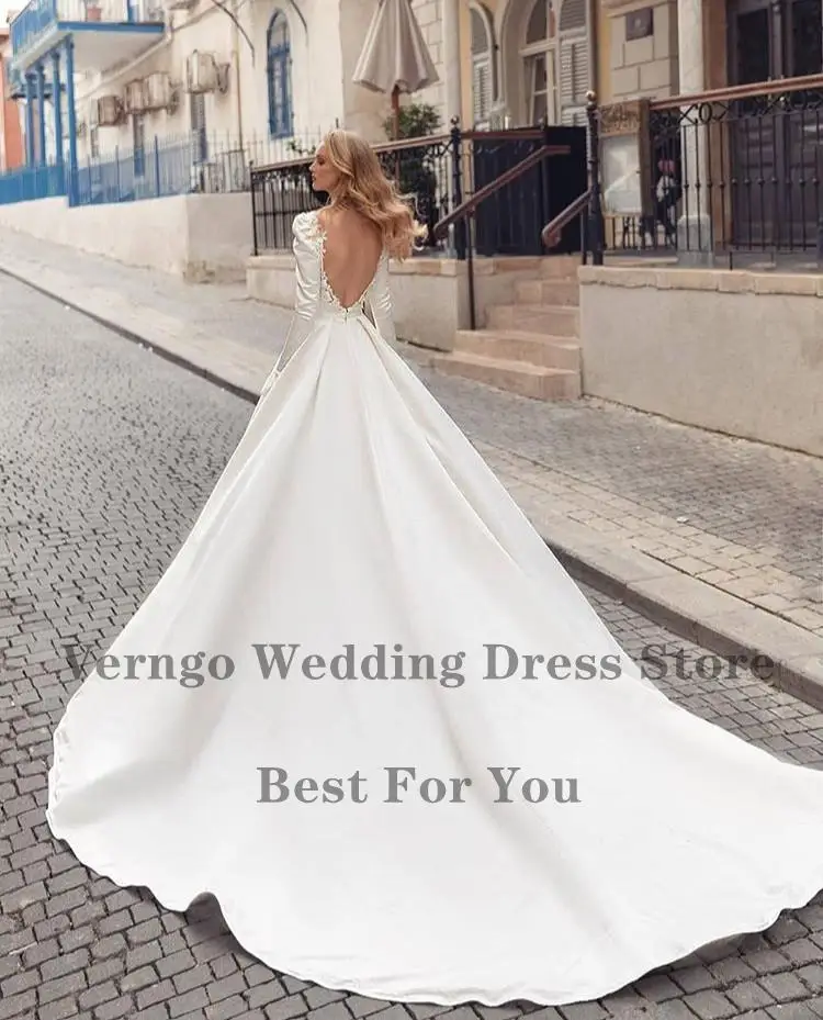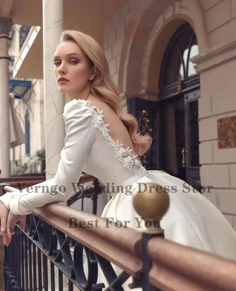 Атласное свадебное платье цвета слоновой кости Verngo, простое платье невесты с длинным рукавом и глубоким круглым вырезом, элегантное платье невесты с открытой спиной на заказ, 2021