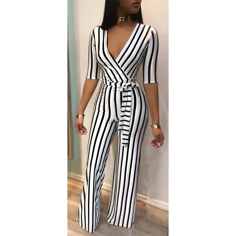 Комбинезон женский полосатый, с глубоким V-образным вырезом, рукавом до локтя и бантом