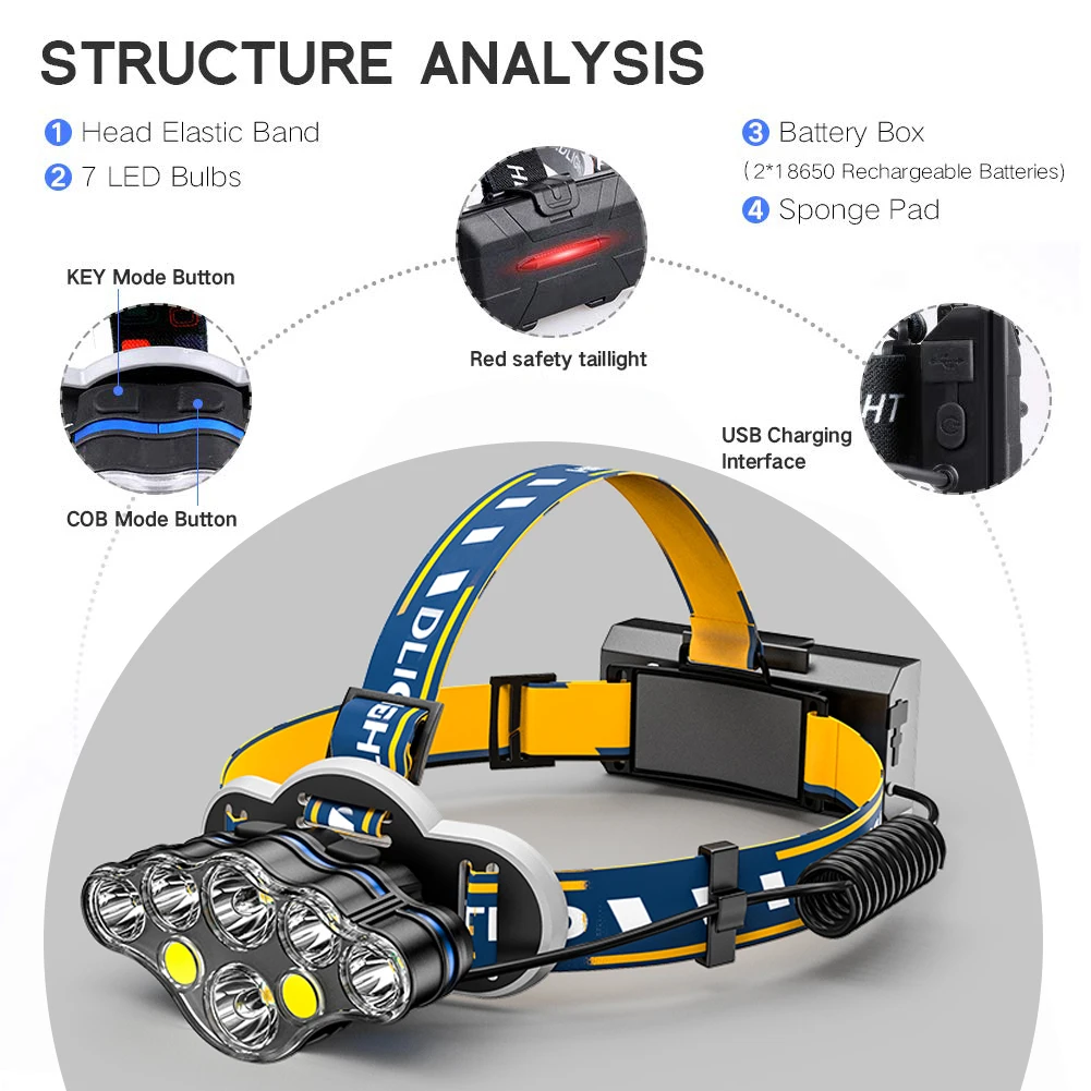 Налобный фонарь с 7 светодиодами, сильный светильник с зарядкой от USB, водонепроницаемый налобный фонарь, светильник с углом поворота 90 градусов, налобный фонарь, налобный фонарь