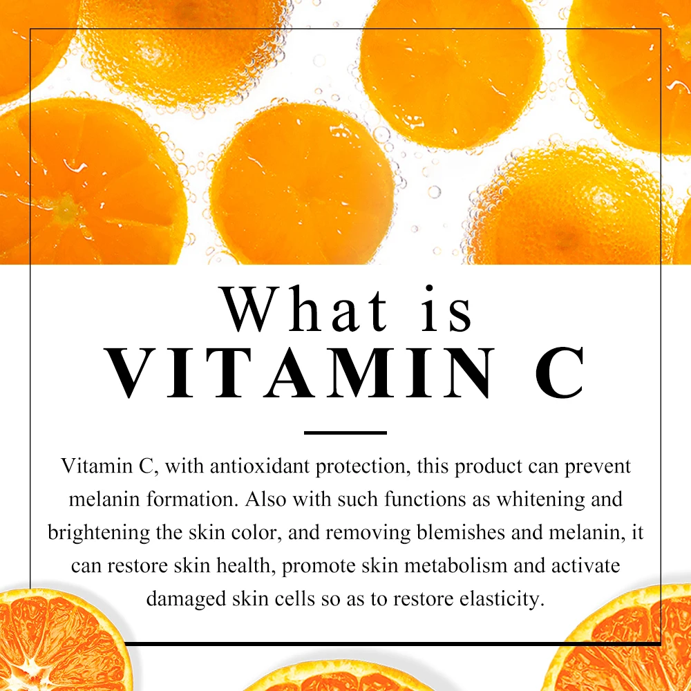Витамин с, с антиоксидантной защитой, этот продукт может предотвратить образование меланина. Также с такими функциями, как отбеливание и осветление цвета кожи, удаление пятен и меланина, он может восстановить здоровье кожи, способствовать метаболизму кожи и активировать поврежденные клетки кожи, чтобы восстановить эластичность.