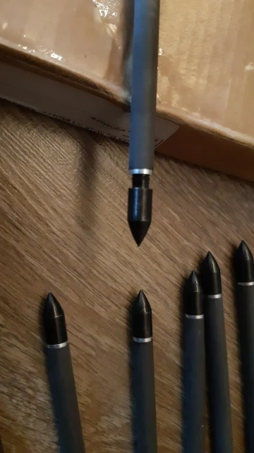 Good quality of arrows, perfectly finished and very strong (100 times better than the original red arrows from EK). They group well when shooting. I still have to test how deep they pinitrate in different materials. The original blue arrows from EK with special tactical hardened point are very deadly. You cannot use this hardened point on these arrows because then they no longer fit in the holder of the Cobra RX because they are too long. The arrows are highly recommended, I'll order back 24 immediately :-)