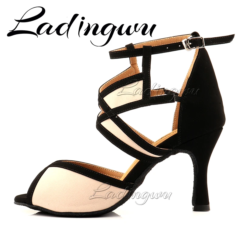 Женские замшевые танцевальные туфли Ladingwu, бежевые туфли для танцев сальсы с геометрическим узором, на каблуке 6-10 см, обувь для латинских бальных танцев