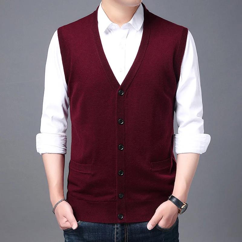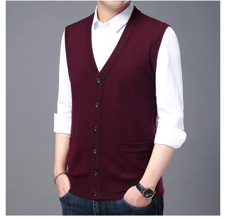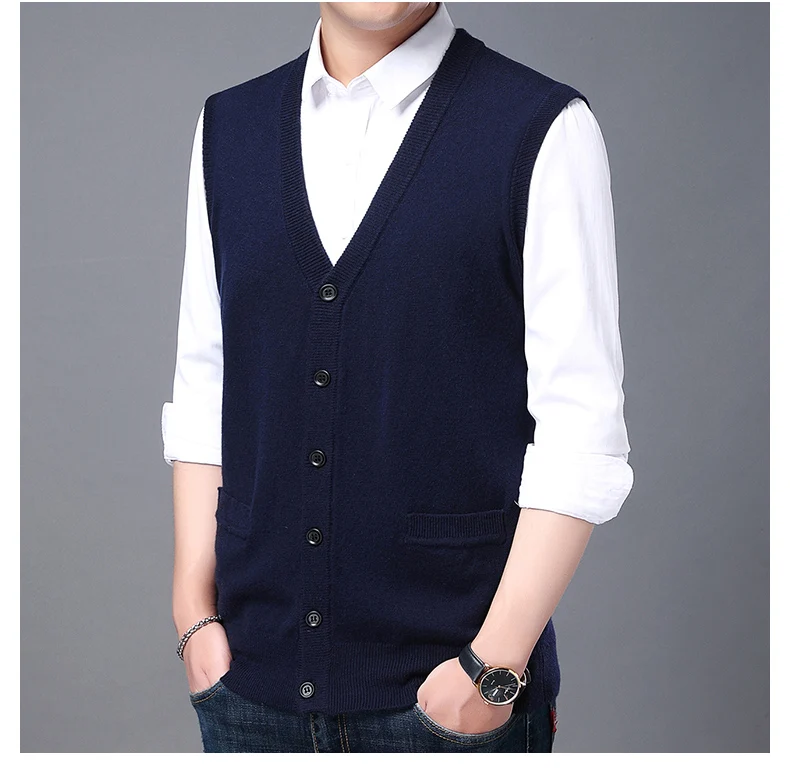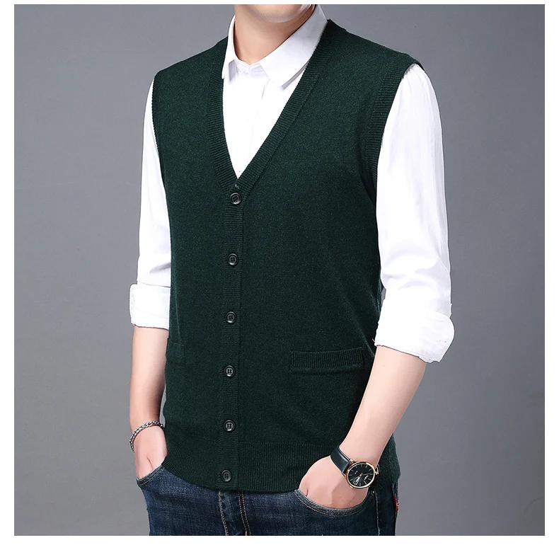 Мужской кашемировый кардиган, Повседневное трикотажное пальто с v-образным вырезом, мужской шерстяной свитер без рукавов с пуговицами и карманами